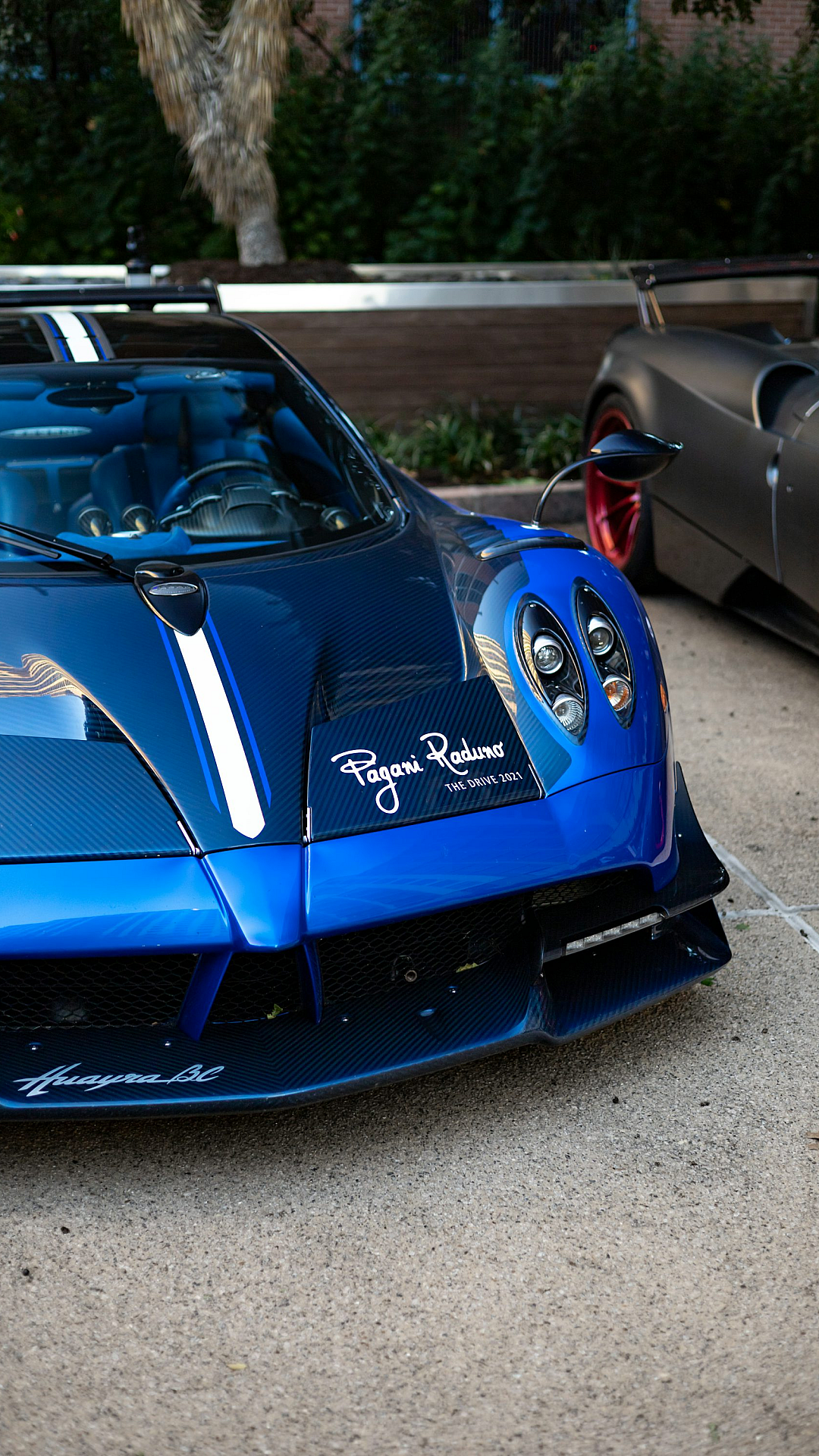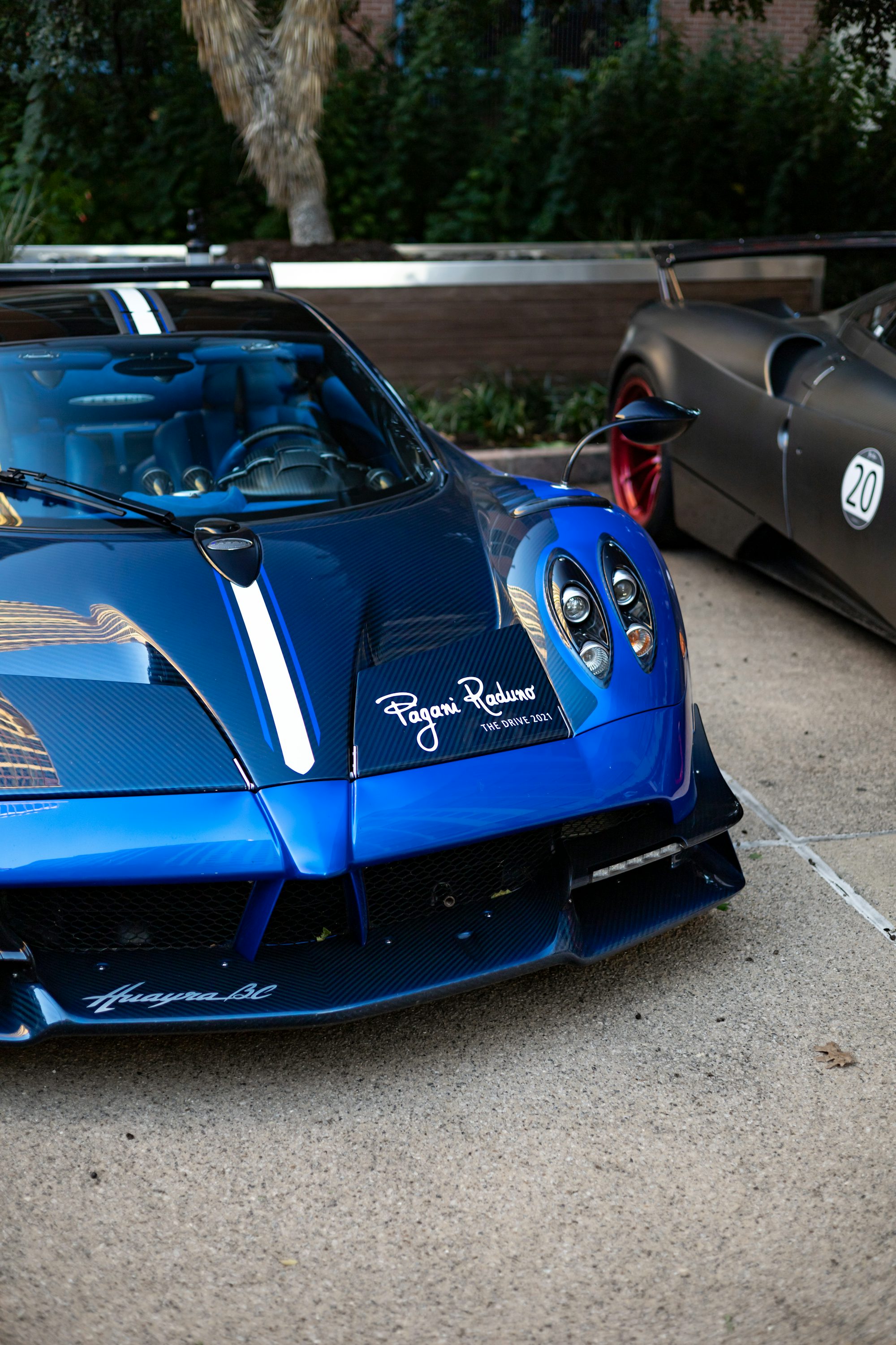 a blue sports car parked next to a black sports car