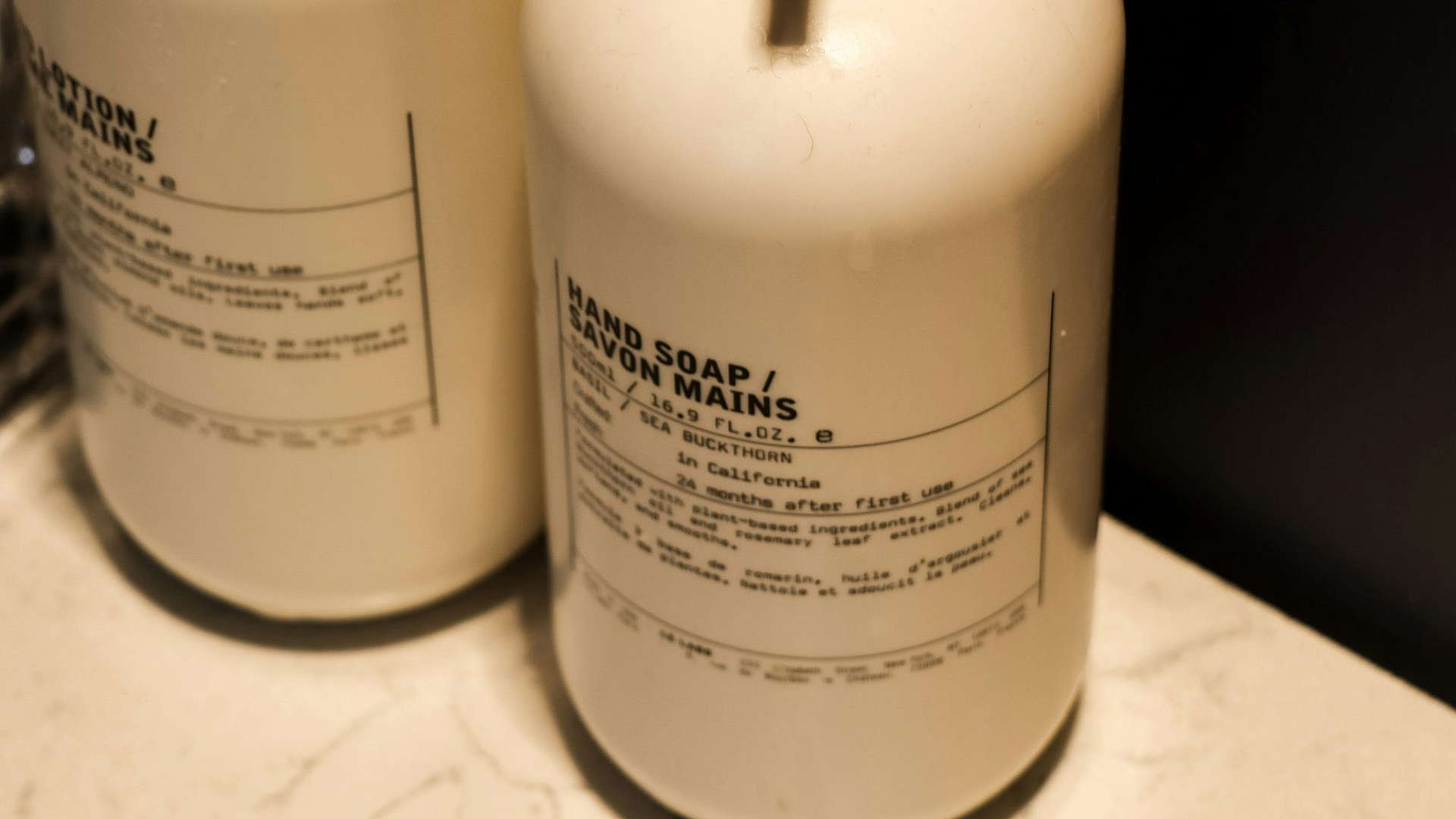 bathroom, bottles, counter, wallpaper, minimalism, simple, clean, modern, aesthetic, interior