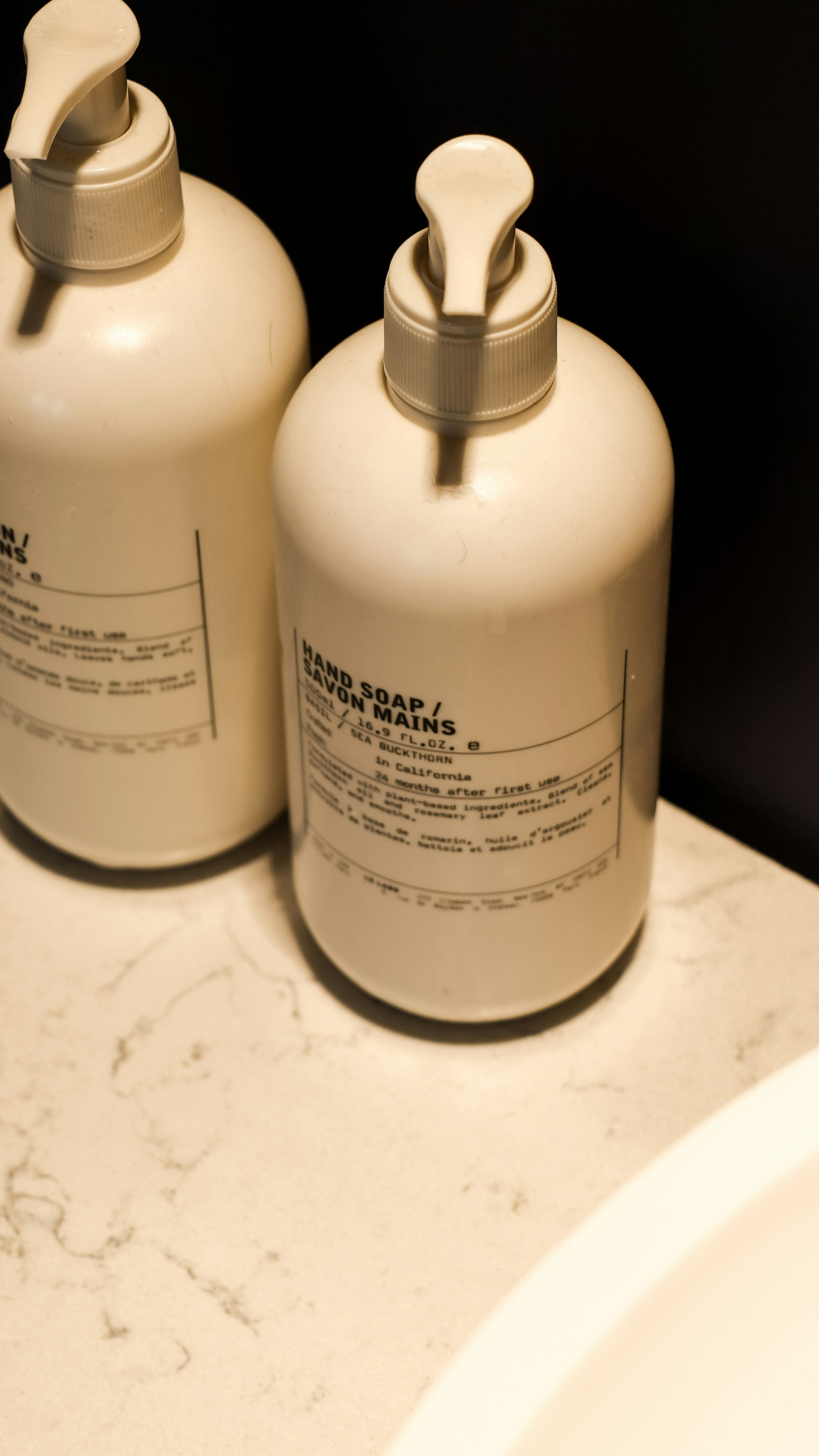 A minimalist wallpaper featuring a couple of bottles subtly placed on a bathroom counter. Clean lines and a muted color palette create a calming atmosphere.