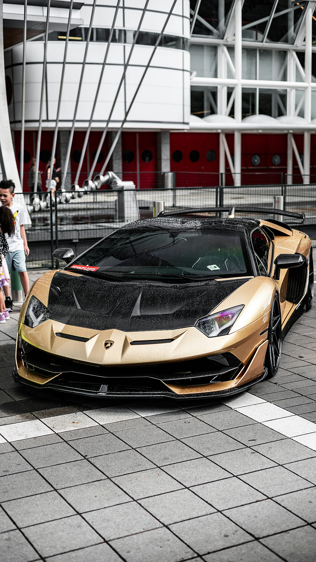 This stunning wallpaper features a gold and black sports car parked elegantly in front of a modern building. The contrast of colors and sleek design makes for a captivating image.