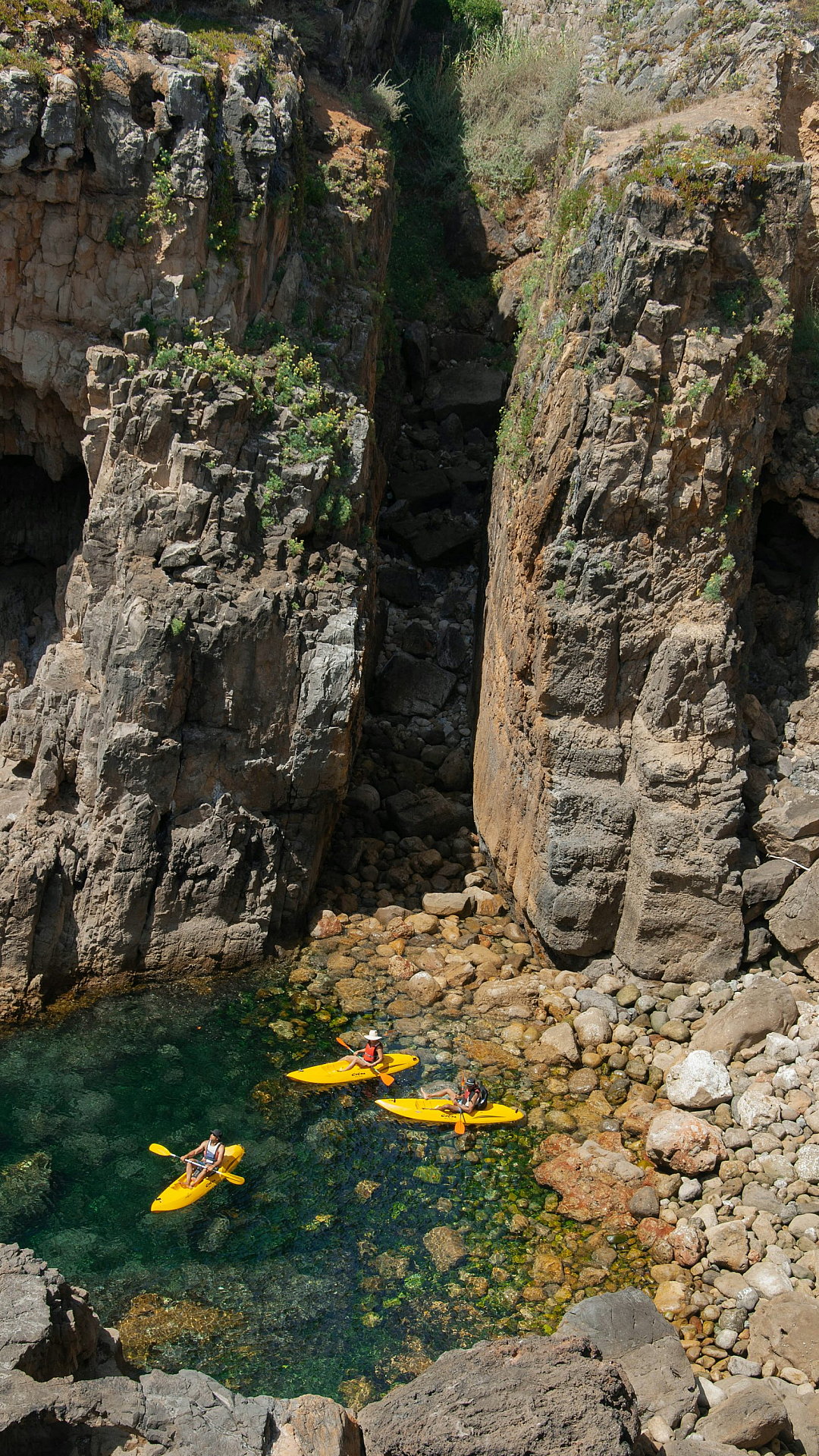 A vibrant wallpaper featuring a group of people enjoying a sunny day kayaking in bright yellow kayaks on calm water. Perfect for a summery feel.