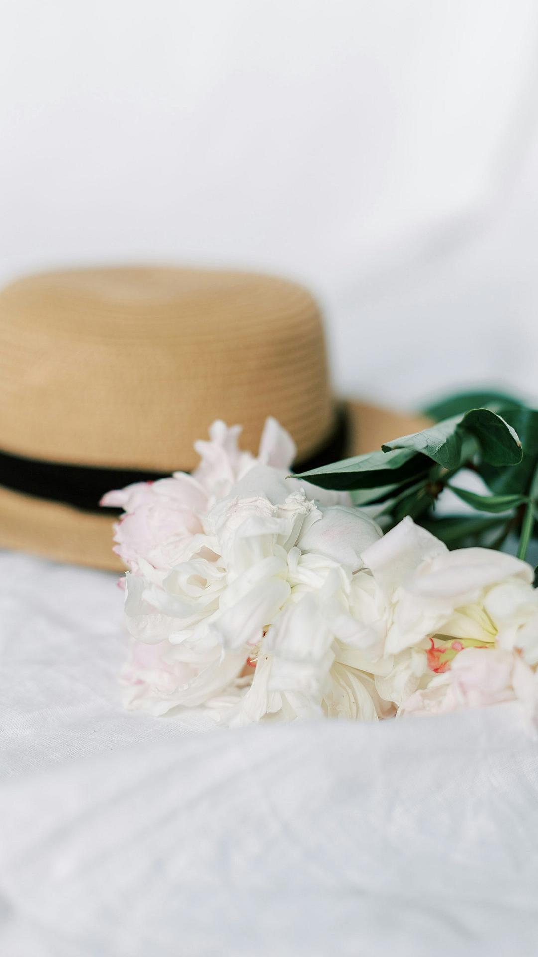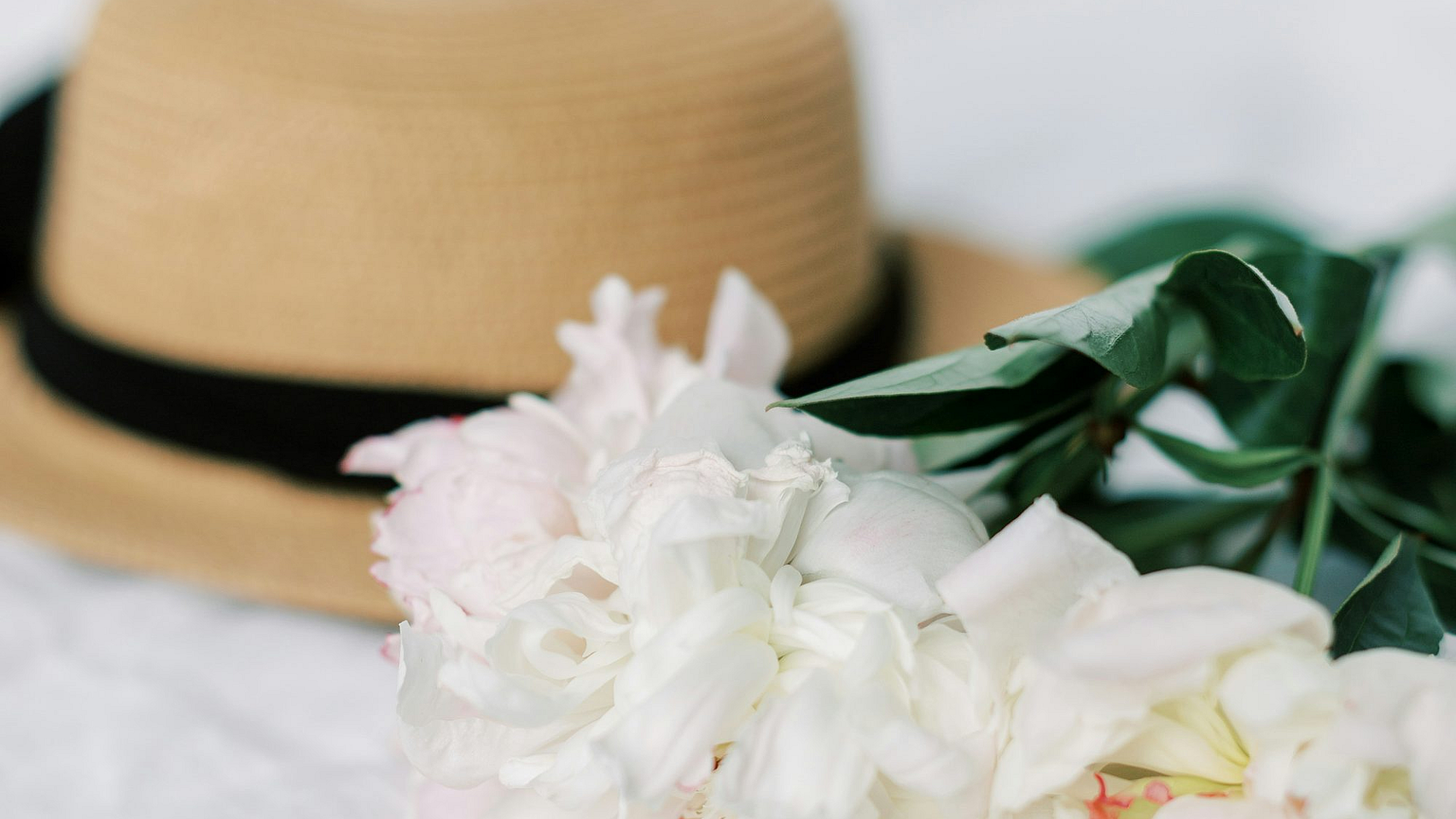 hat, flowers, white sheet, wallpaper, floral, minimalism, simple, elegant, aesthetic, background