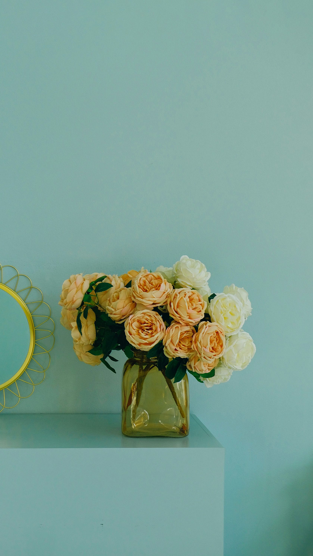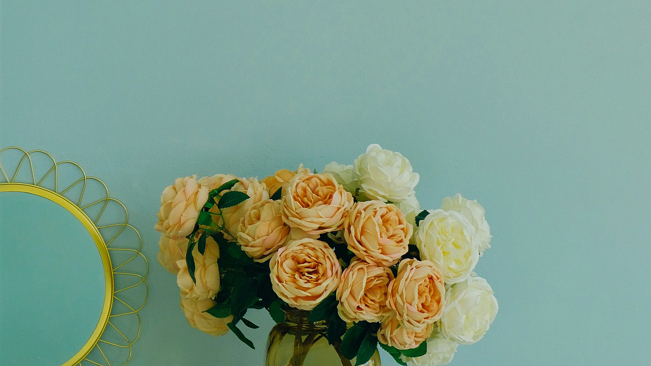 A serene wallpaper featuring a delicate vase filled with vibrant flowers, subtly reflected in a nearby mirror. Perfect for a calming ambiance.