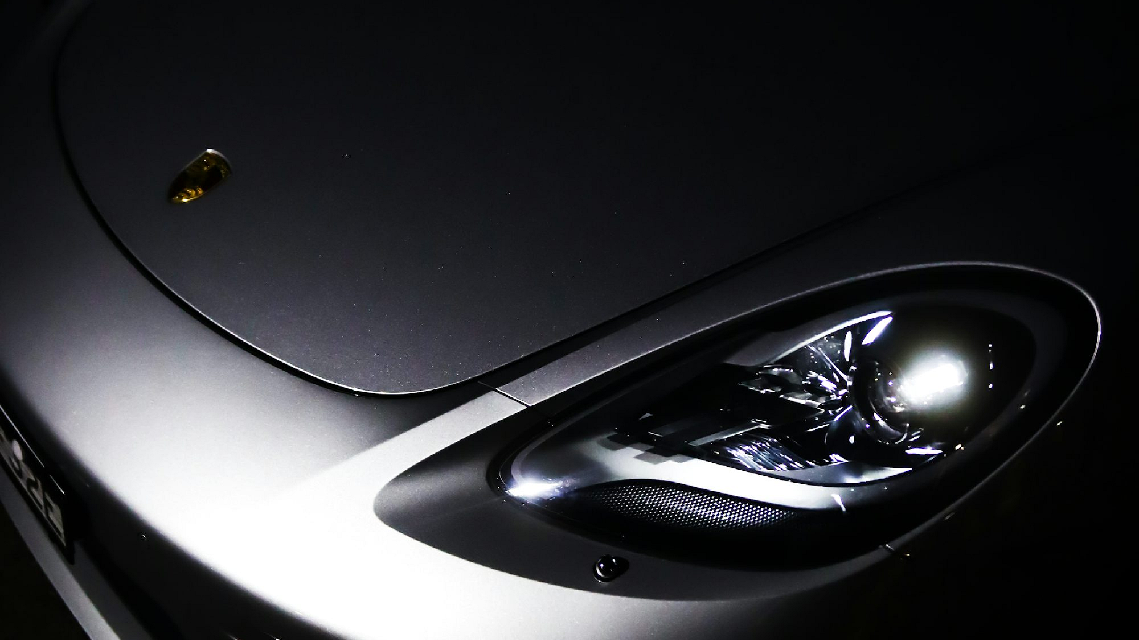 A stunning image of a black Porsche 911, sharply contrasted against a black surface. The dark tones create a dramatic and elegant aesthetic.