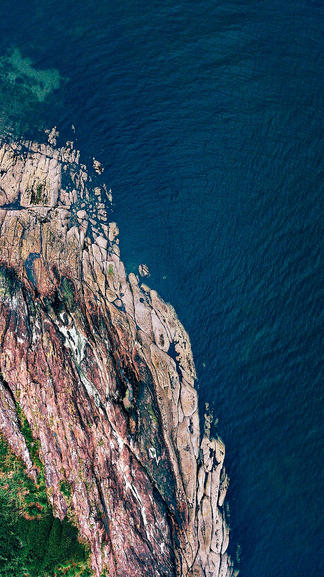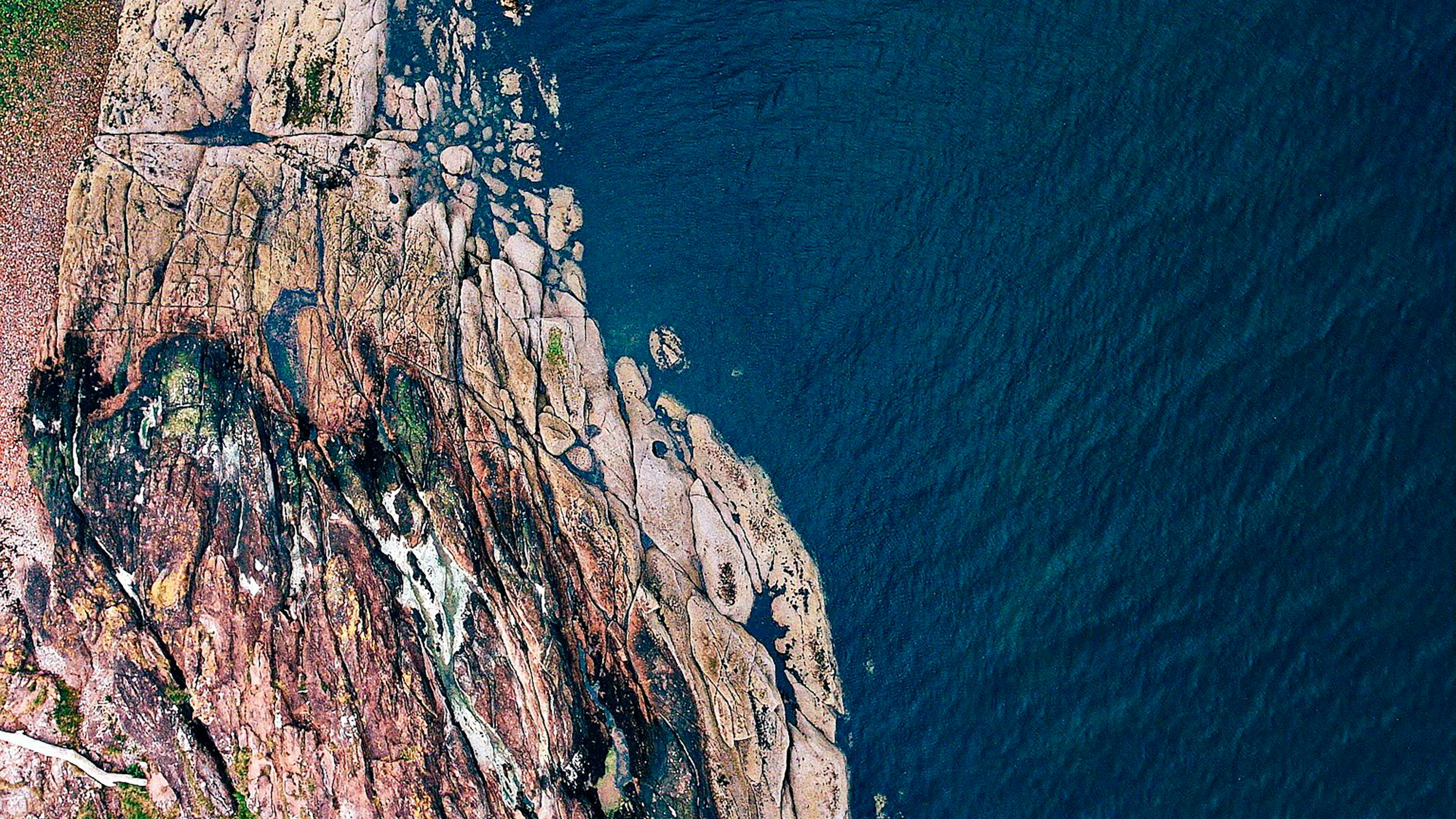 A stunning wallpaper featuring a brown rocky mountain dramatically juxtaposed against a vibrant blue sea under the daytime sun. A breathtaking landscape perfect for your desktop.