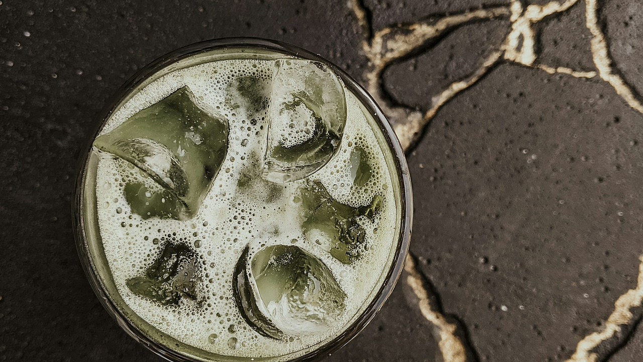 A minimalist wallpaper featuring a clear drinking glass filled with a vibrant green liquid. Perfect for a clean and refreshing aesthetic.