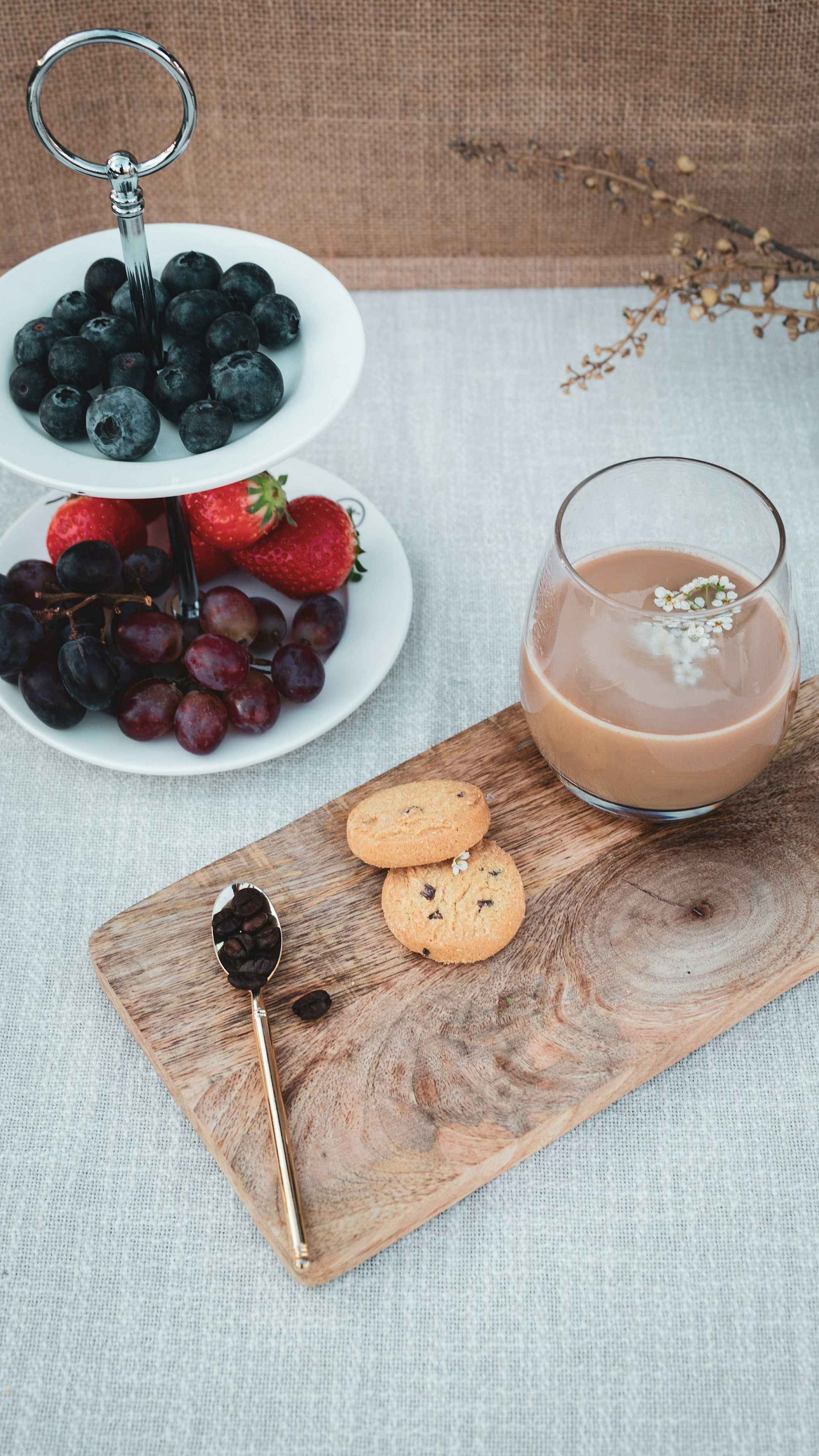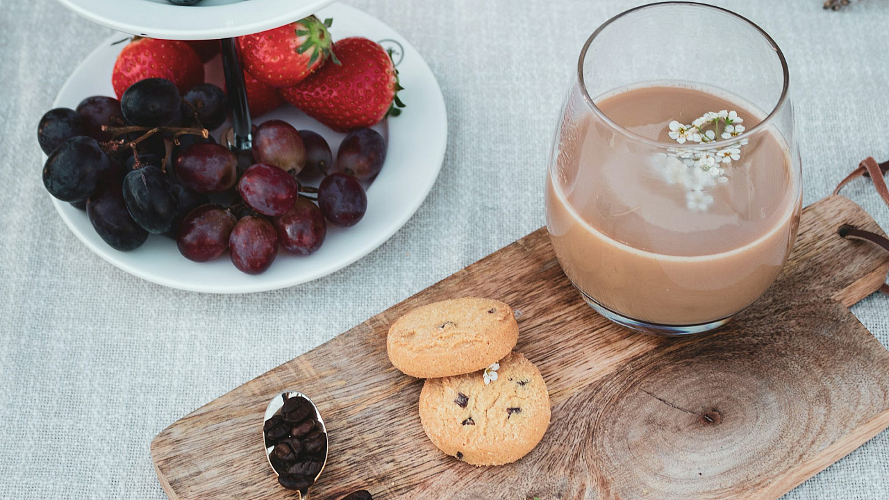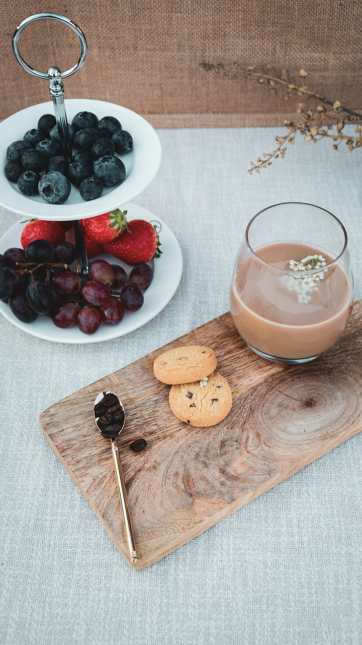 A simple yet elegant wallpaper featuring a clear drinking glass filled with orange liquid, resting on a rustic brown wooden chopping board. Perfect for a clean and minimalist aesthetic.