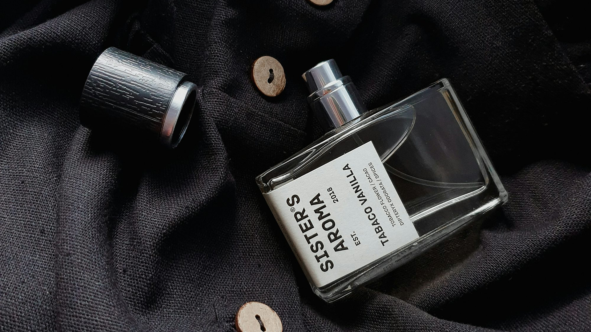 A minimalist wallpaper featuring a clear glass bottle resting on a piece of black textile. Simple yet elegant.