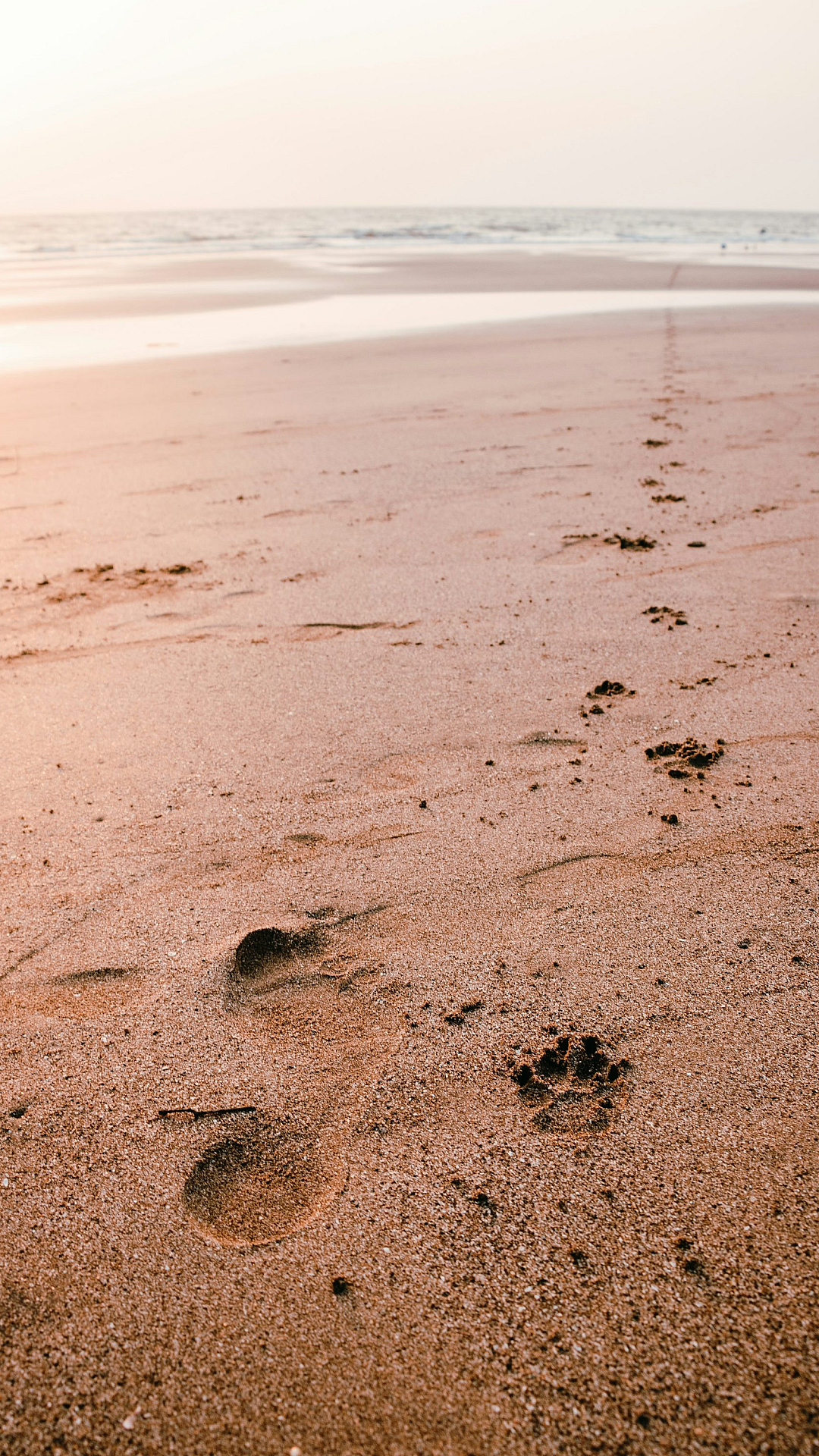 footprints, sand, beach, ocean, sea, daytime, sun, shore, coast, waves