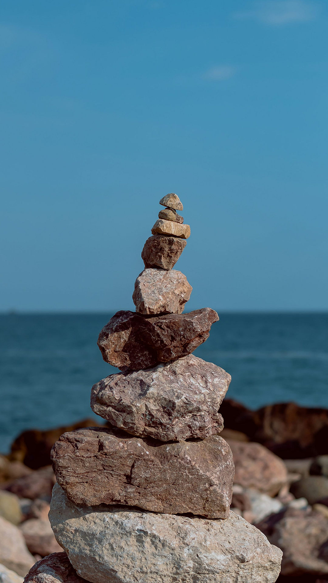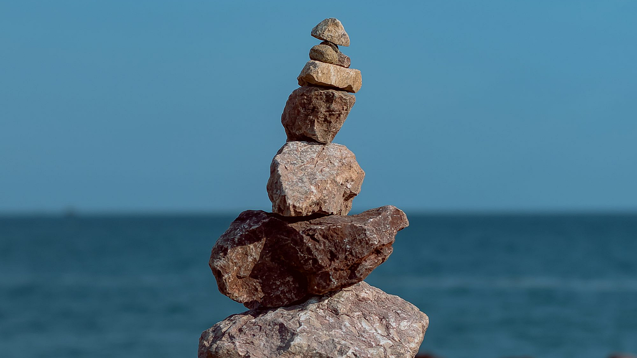 A serene image showcasing gray and brown stones near a body of water under the daytime sun. Perfect for a calming desktop background.