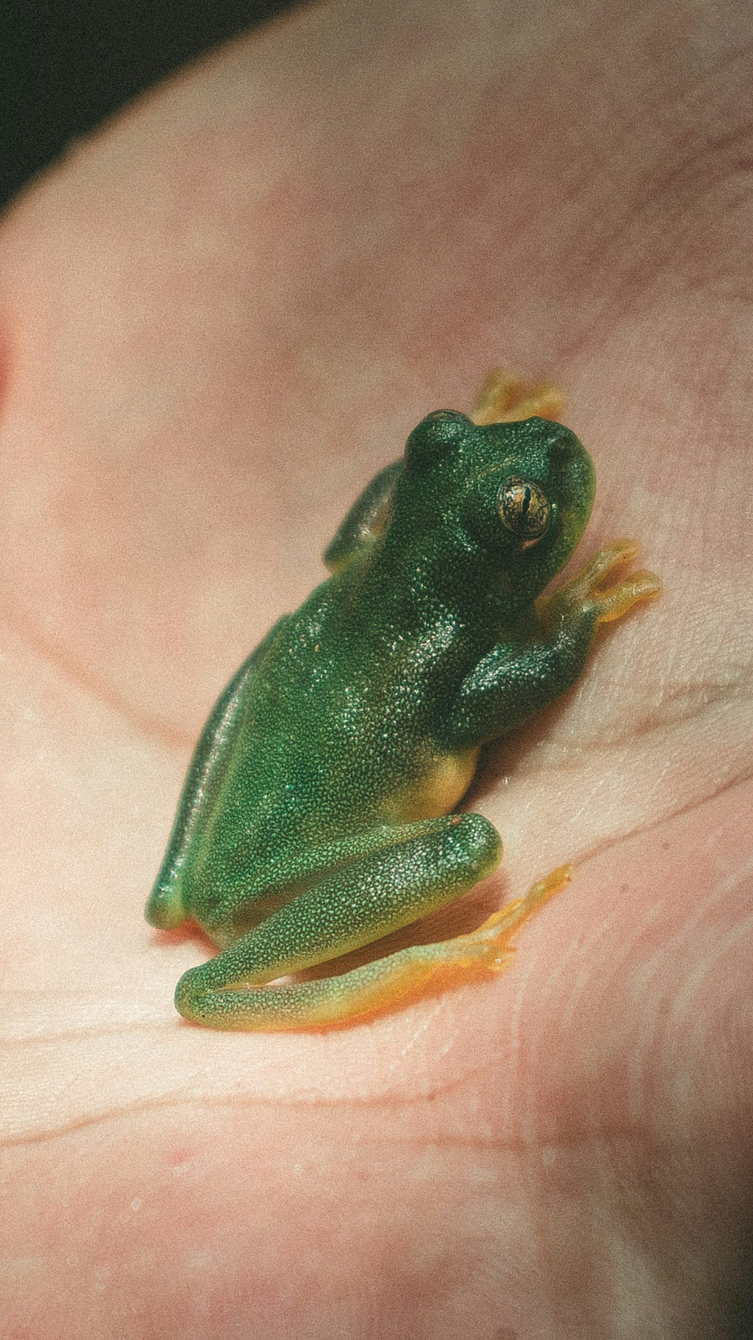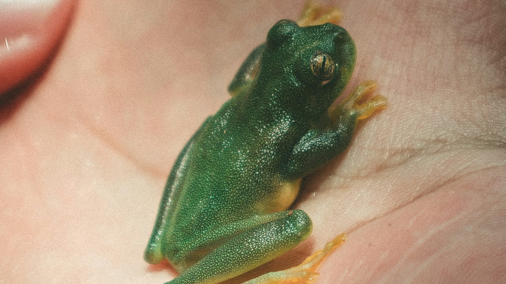 A vibrant wallpaper featuring a green frog perched serenely on a lush palm leaf. Perfect for nature lovers!
