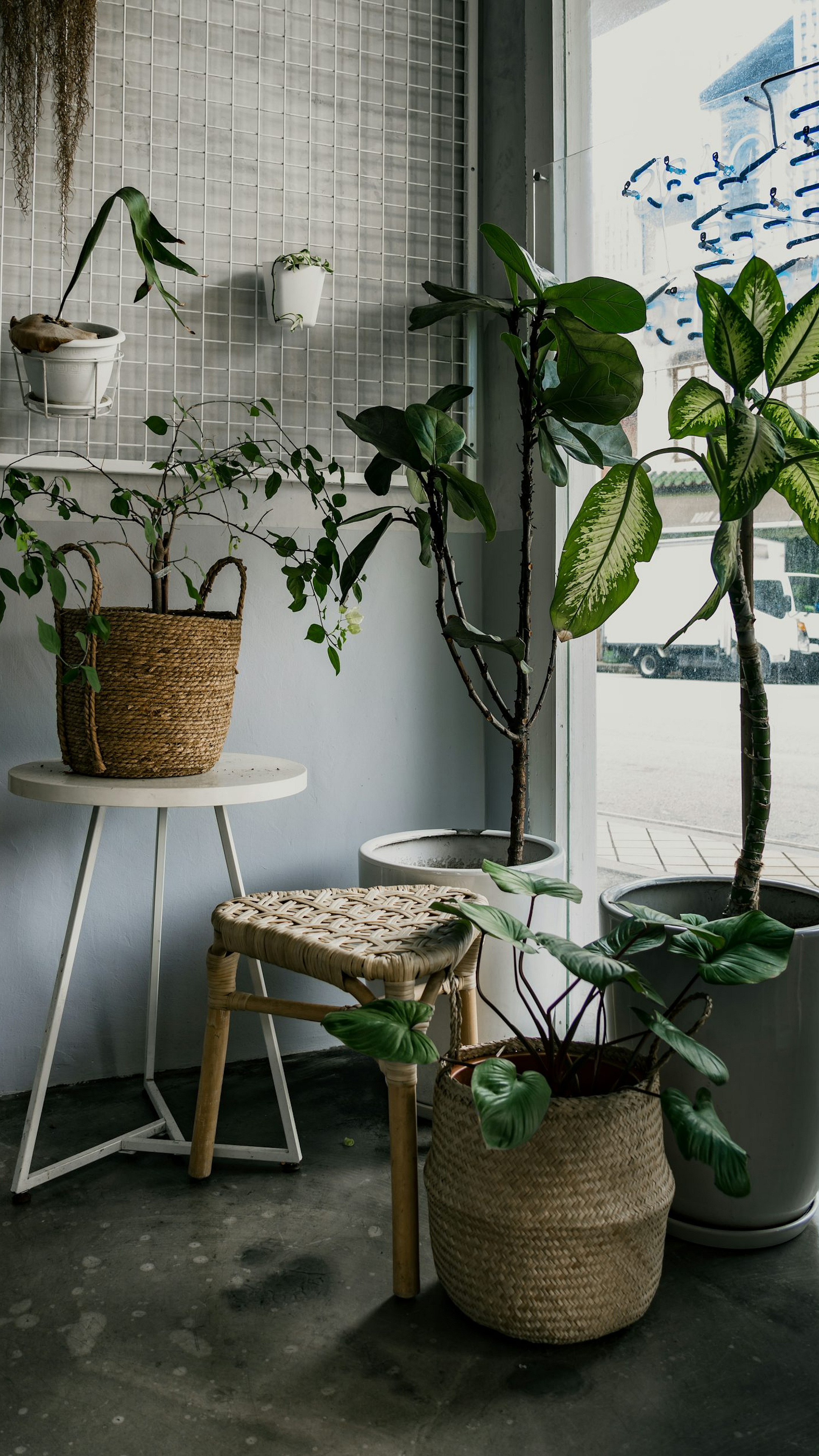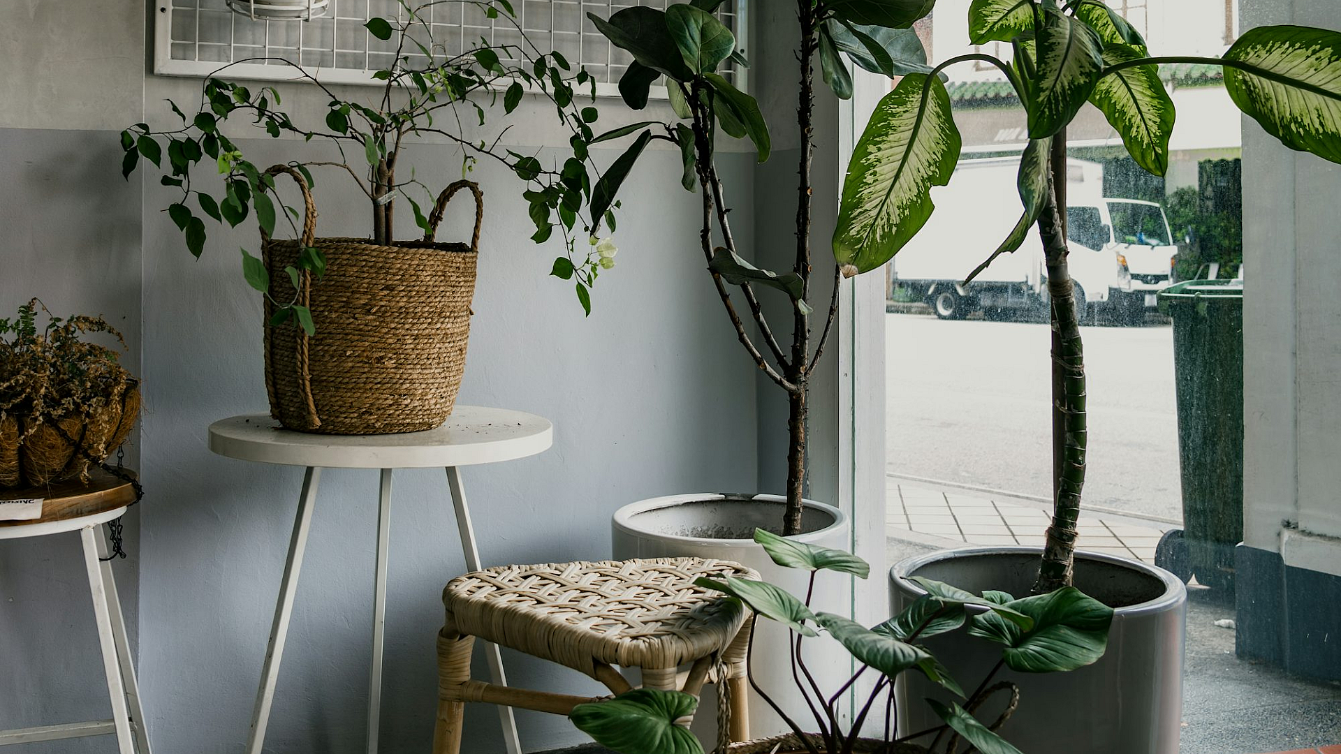 A serene image of a green potted plant, elegantly placed on a white metal table. Perfect for a minimalist or nature-themed desktop background.