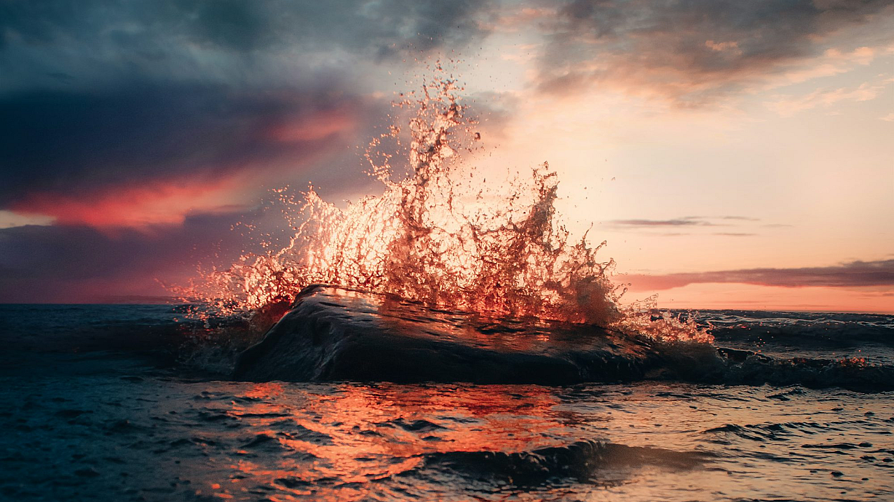 A stunning sunset illuminates a leafless tree standing solitary on the shore, creating a captivating silhouette against the vibrant sky. Perfect for desktop or mobile backgrounds.