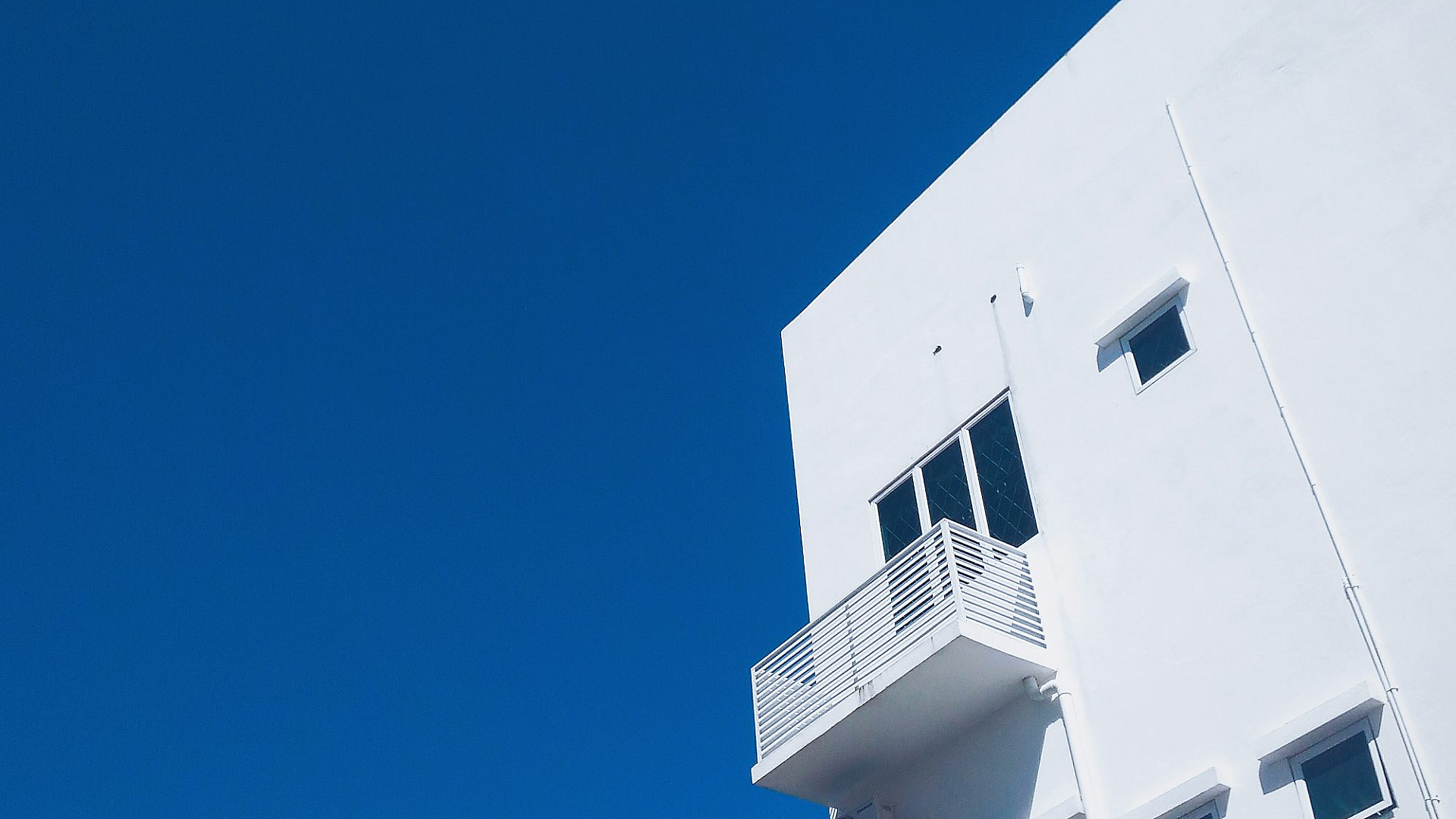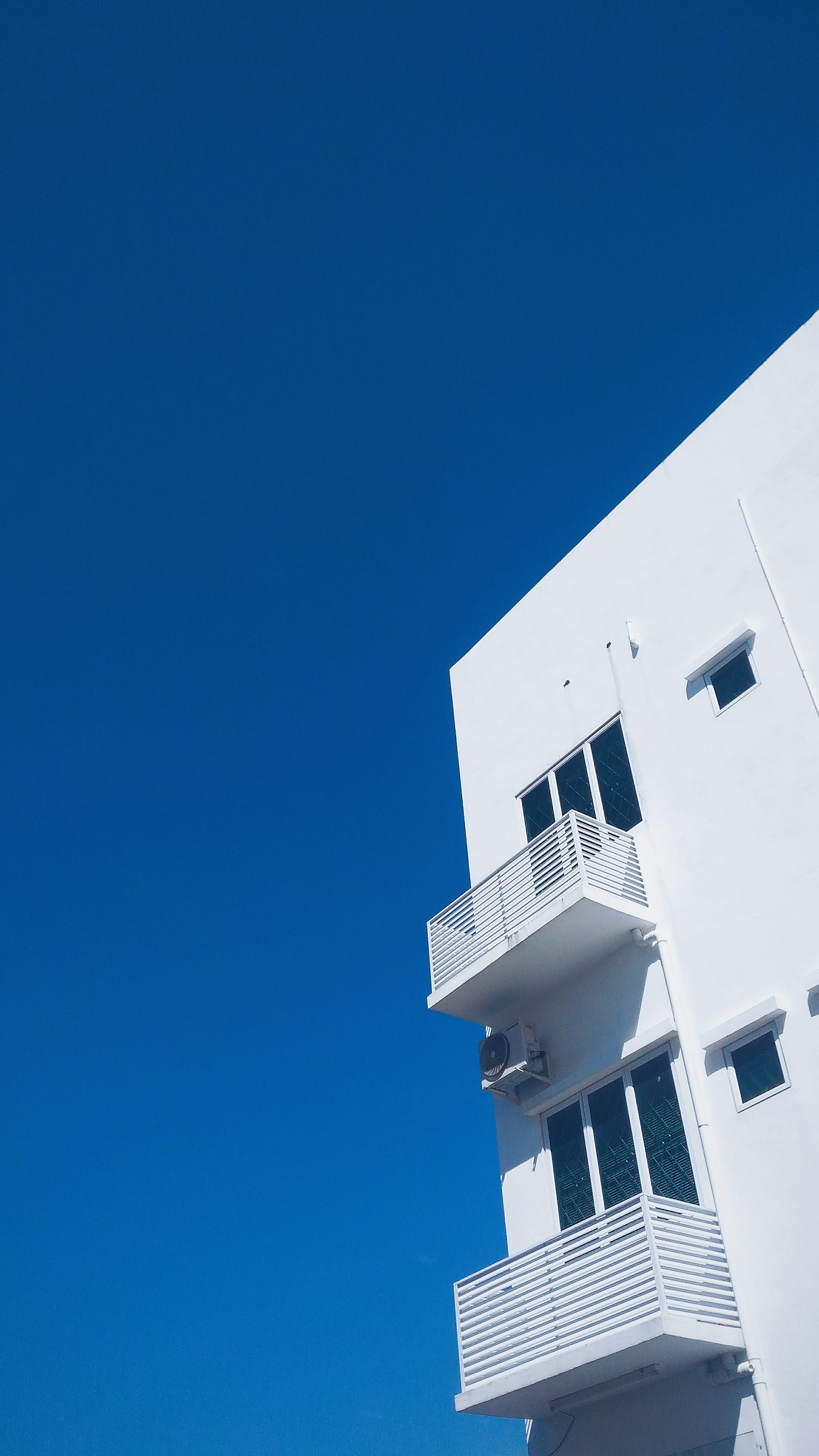 This wallpaper features a striking low-angle shot of a pristine white concrete building, showcasing its clean lines and architectural details. Perfect for a minimalist aesthetic.