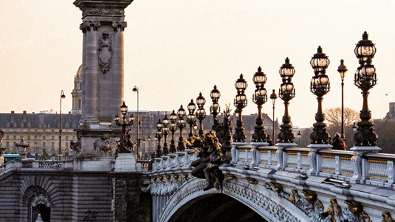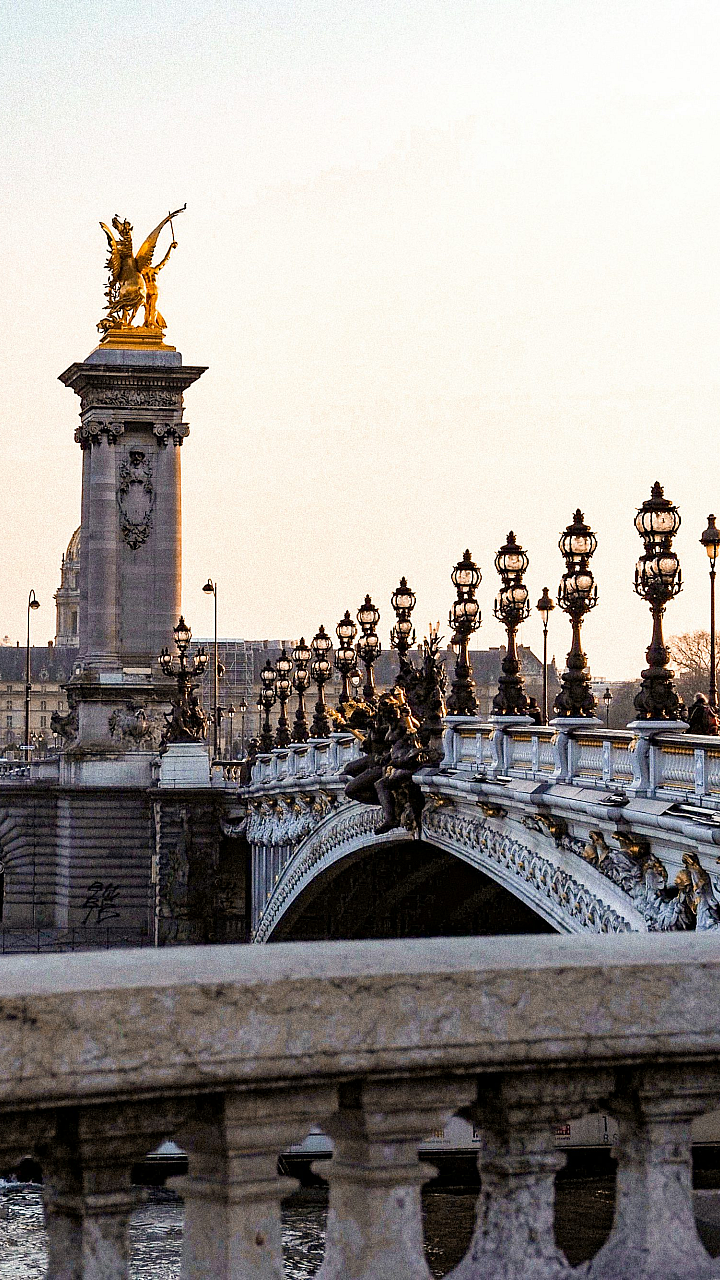 A stunning wallpaper featuring people strolling across a gray concrete bridge under the daytime sun. Urban and serene.