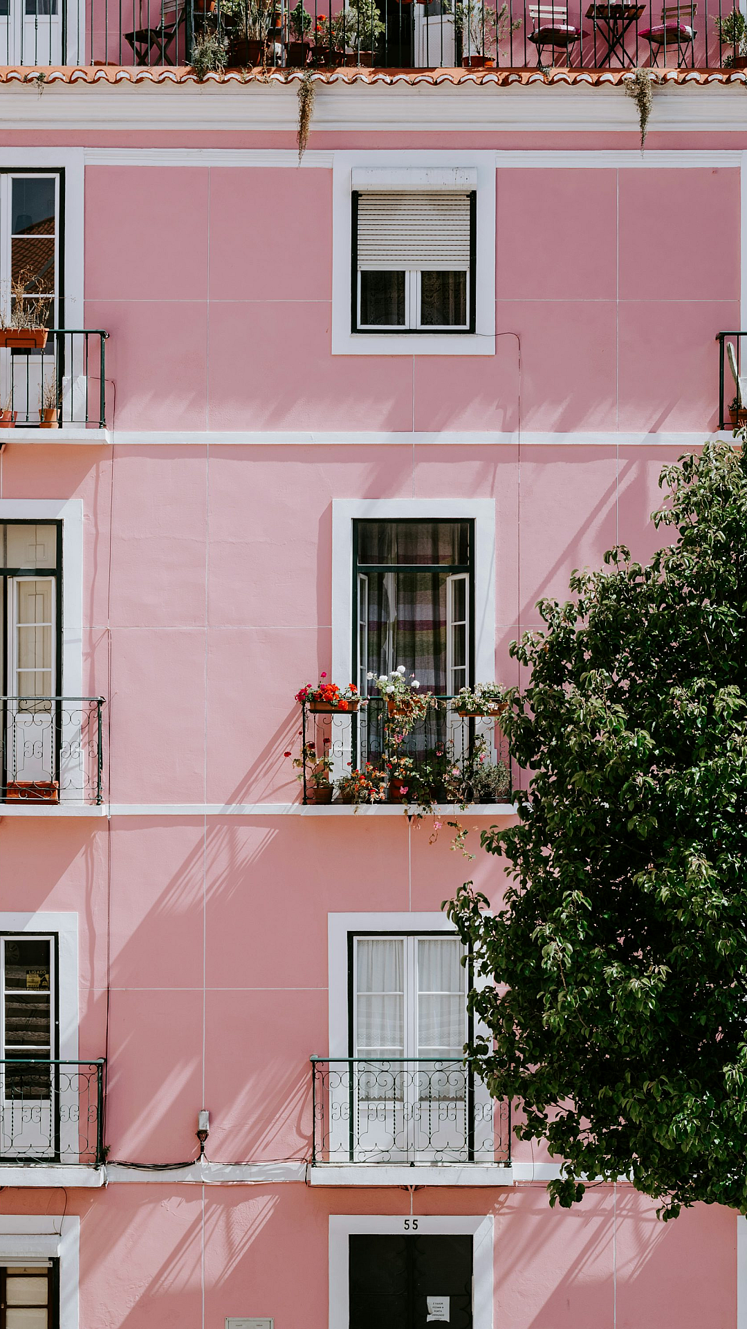 pink concrete, commercial building, green tree, building wallpaper, architecture wallpaper, concrete texture, pink building, nature and architecture, urban landscape, city wallpaper