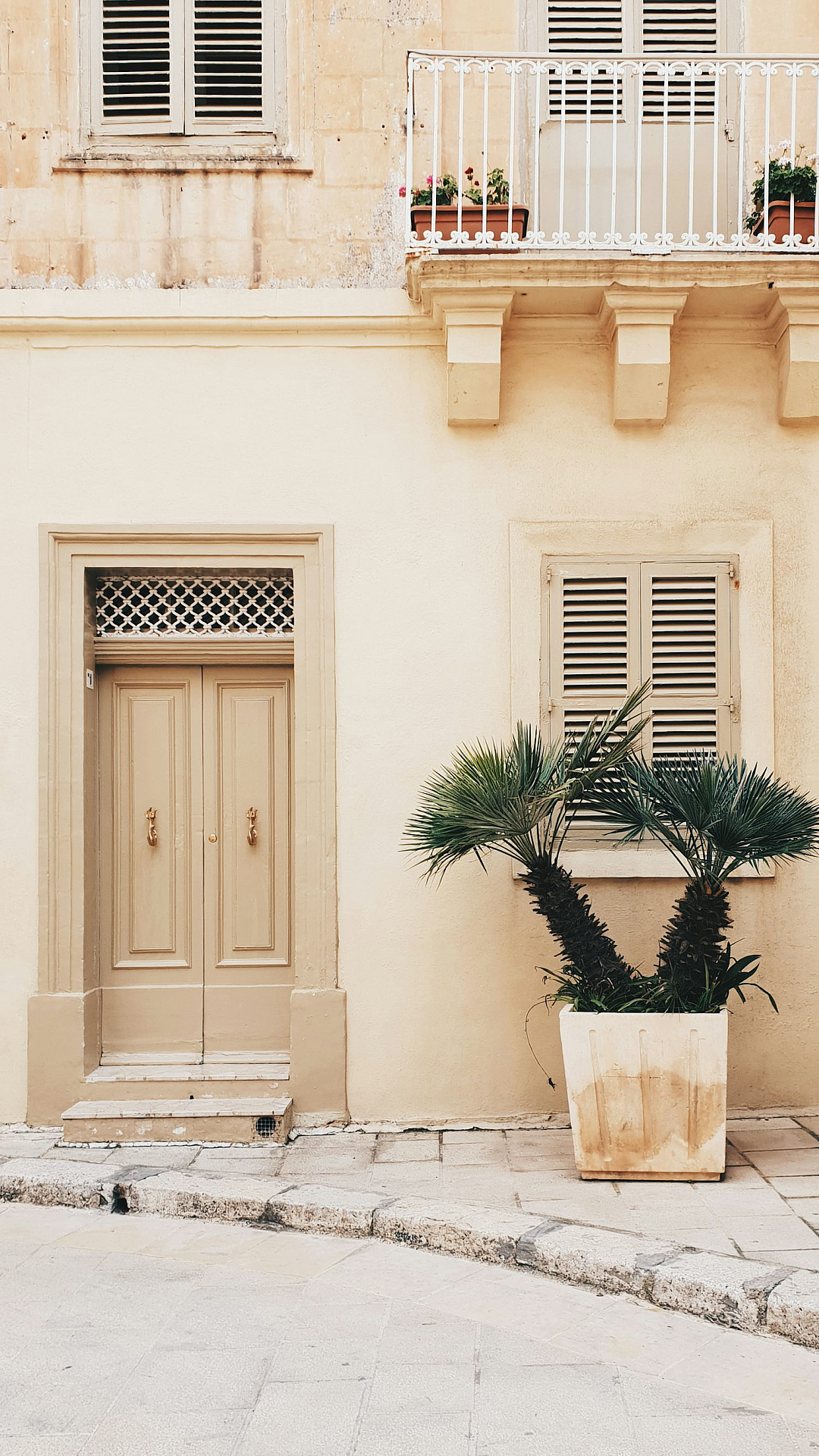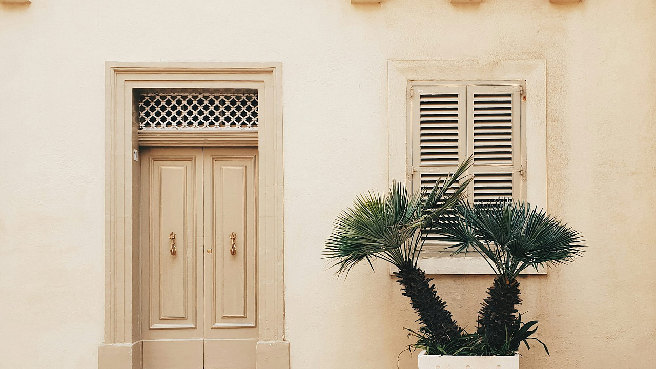 A serene image of a potter plant thriving near a modern concrete house, offering a tranquil and stylish wallpaper option. Perfect for minimalist aesthetics.