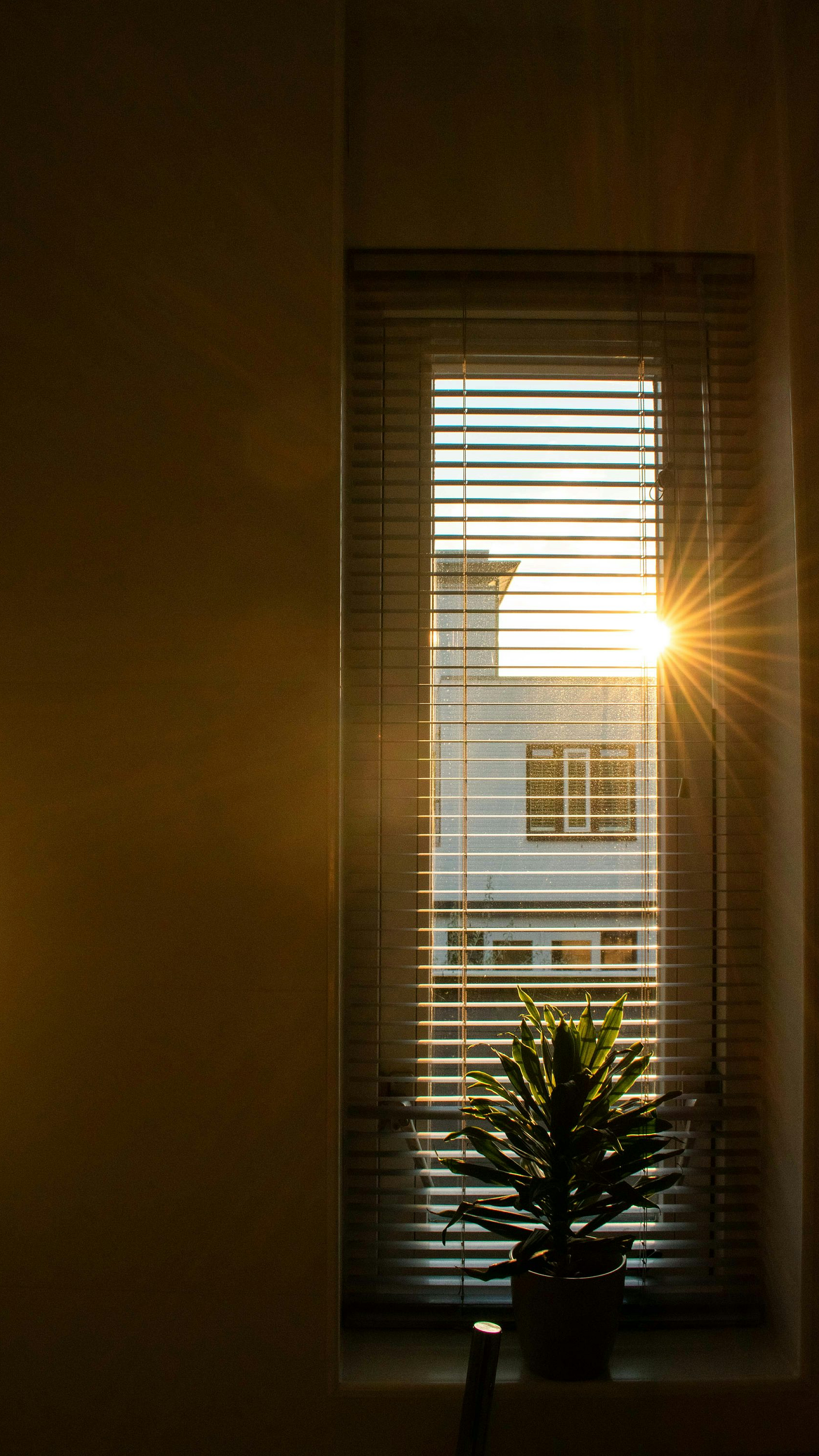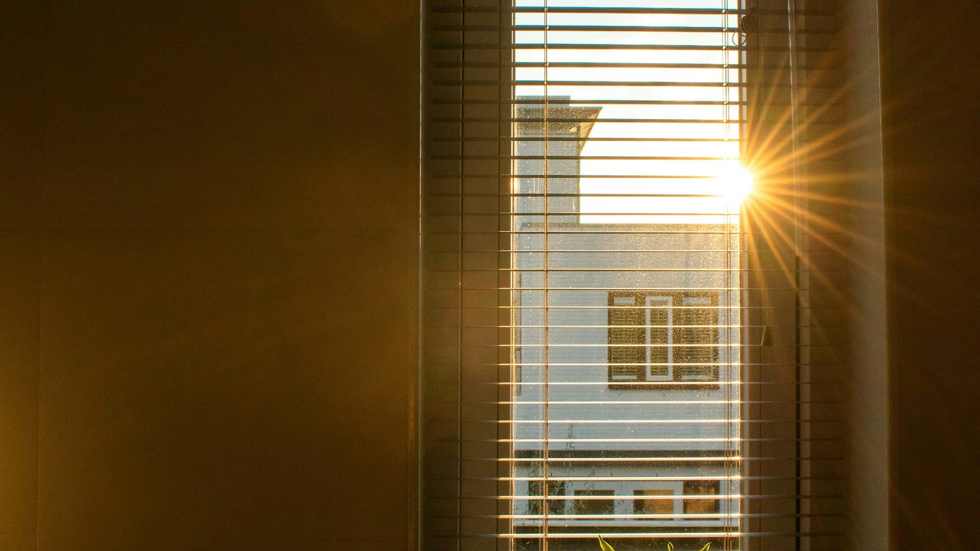 A serene image of sunlight streaming through a window, illuminating a potted plant in the foreground. A peaceful and bright wallpaper.