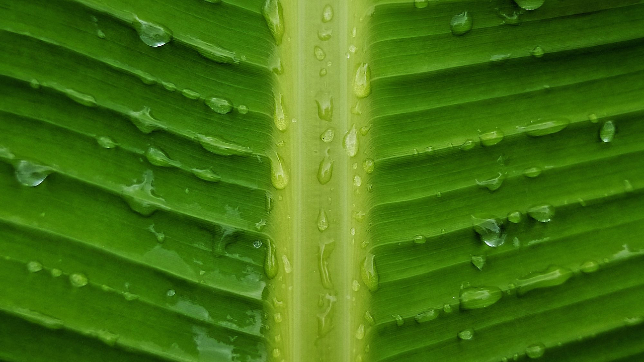 This wallpaper features a stunning close-up of water droplets clinging to a vibrant green leaf, showcasing the beauty of nature’s details.
