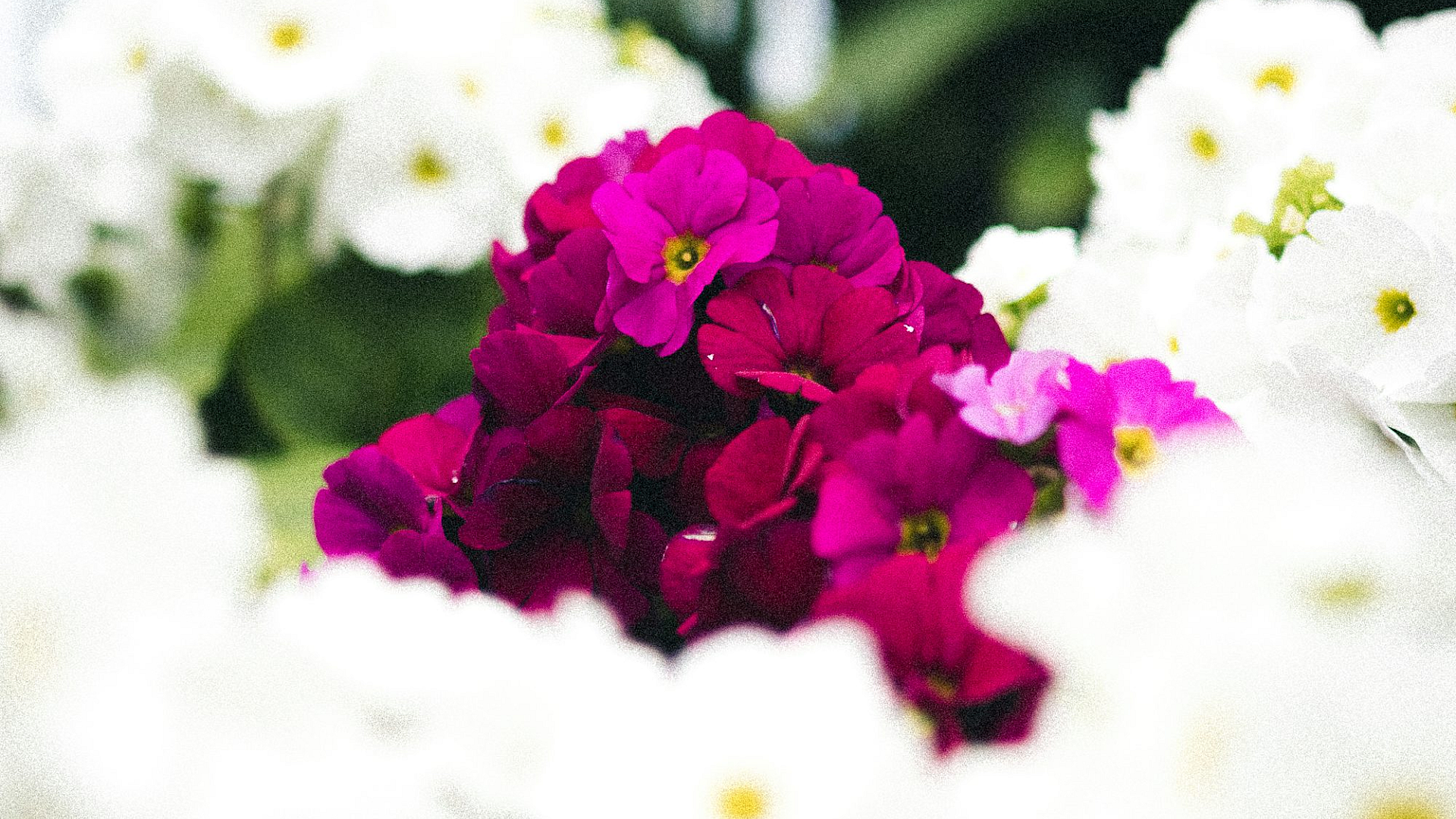 This wallpaper features a charming tilt-shift effect on a cluster of white and purple flowers, creating a miniature-like scene with a dreamy and soft focus.