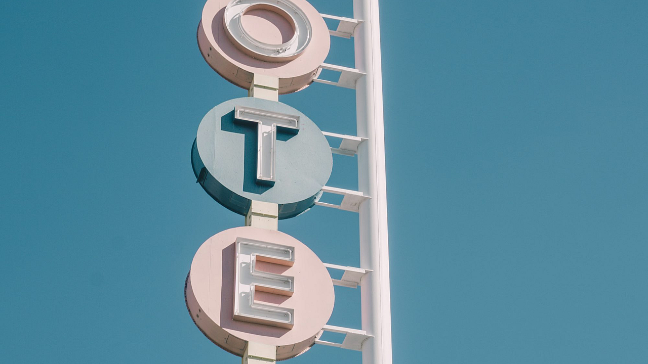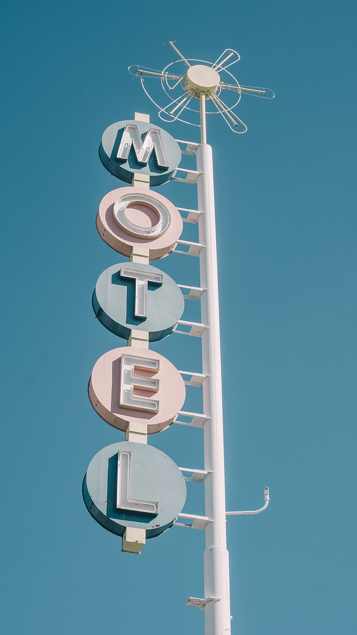 A vibrant wallpaper featuring a retro-styled motel sign in shades of white and teal. Perfect for adding a touch of vintage charm to your desktop.