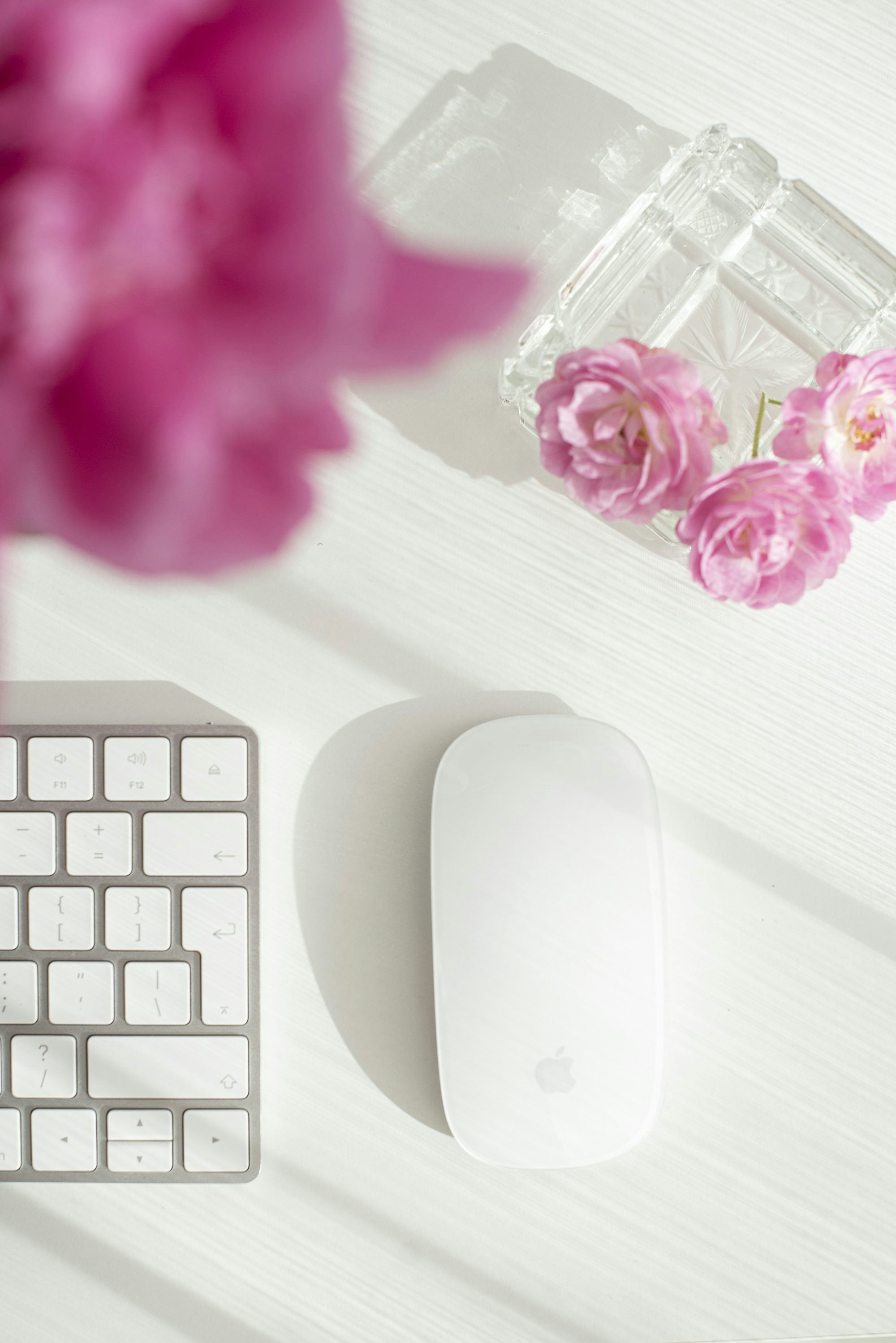 white apple magic mouse, pink flower, white wooden table, minimalist wallpaper, desktop wallpaper, apple mouse, floral wallpaper, clean aesthetic, simple background, technology wallpaper