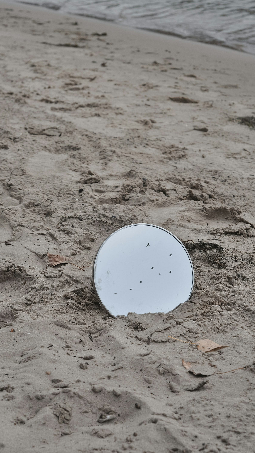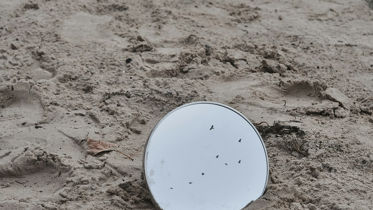 A minimalist wallpaper featuring a white round plastic object contrasting sharply against brown soil. Simple yet striking.