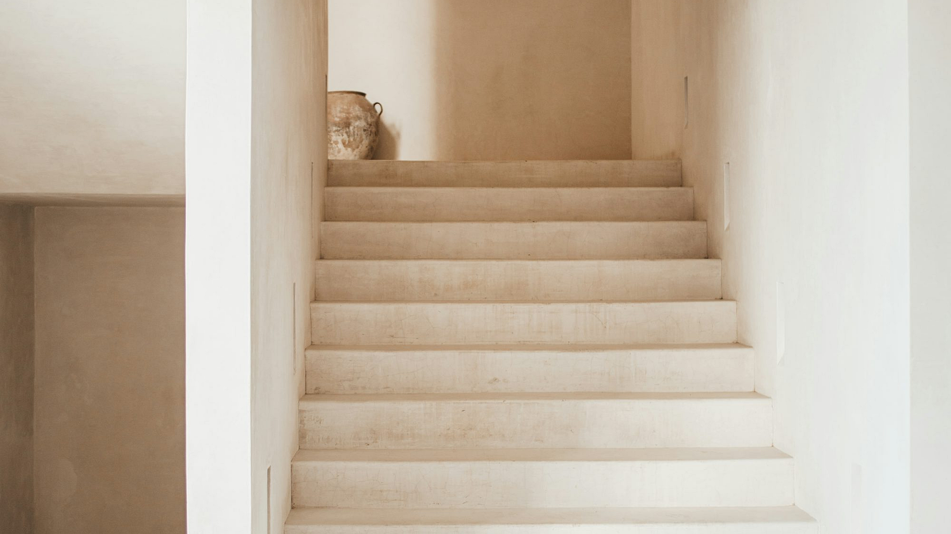 A clean and simple wallpaper featuring a white wooden staircase with matching white wooden railings, perfect for a minimalist or modern interior design.