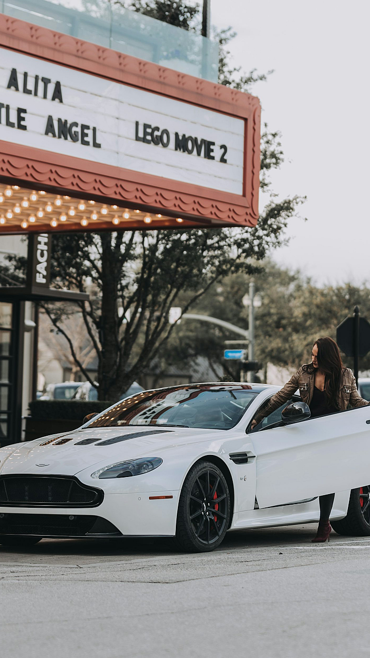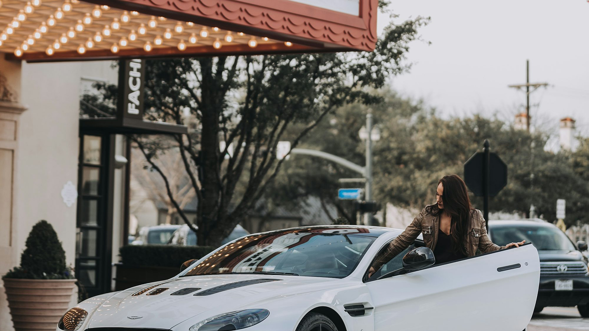 A stunning wallpaper featuring a stylish woman stepping out of a luxurious sports car parked near a grand theater. The scene evokes elegance and sophistication.