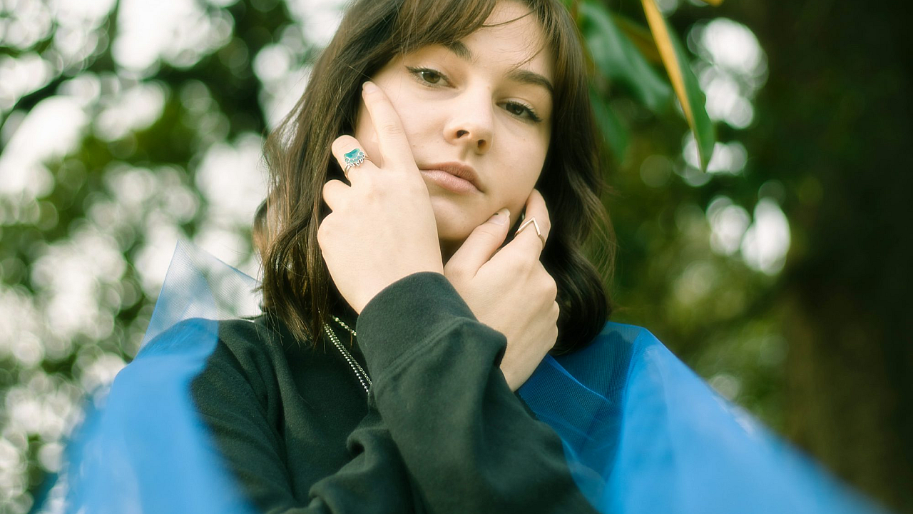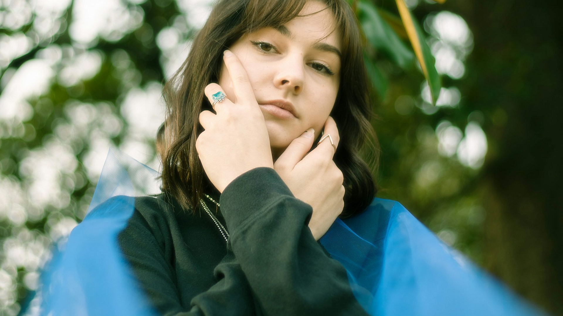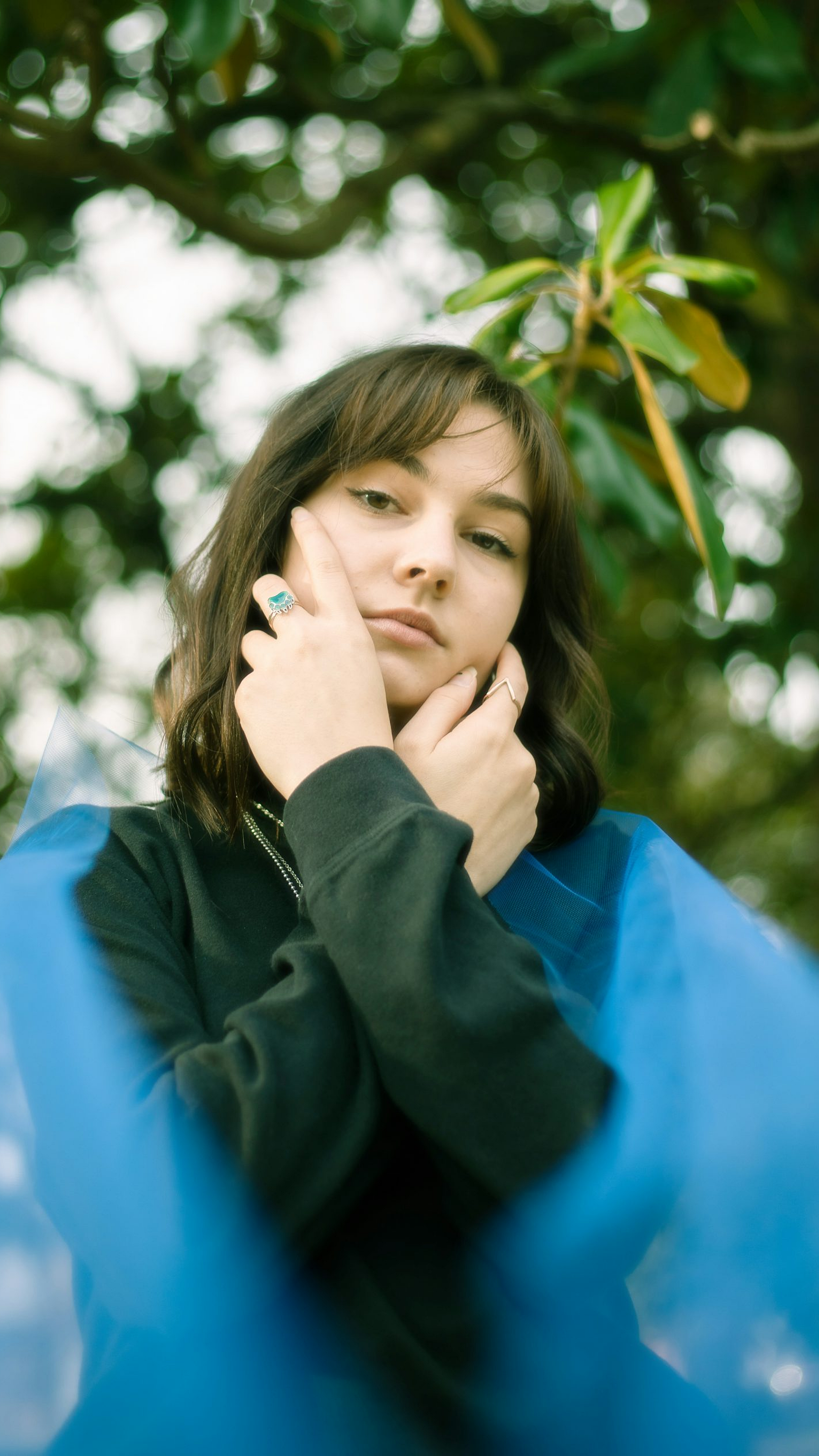 woman, black jacket, green tree, daytime, nature, outdoor, standing, portrait, wallpaper, background