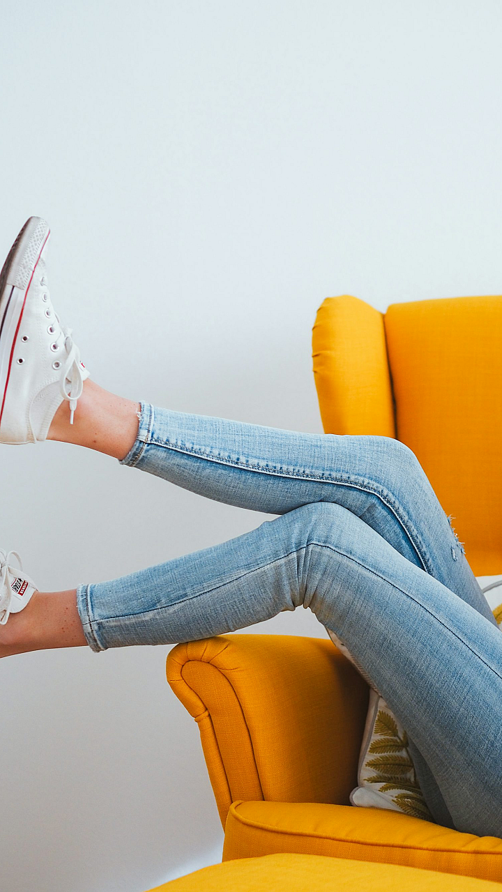 woman in blue denim jeans and white converse all star high top sneakers sitting on orange