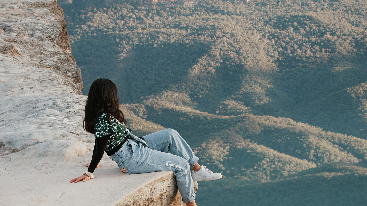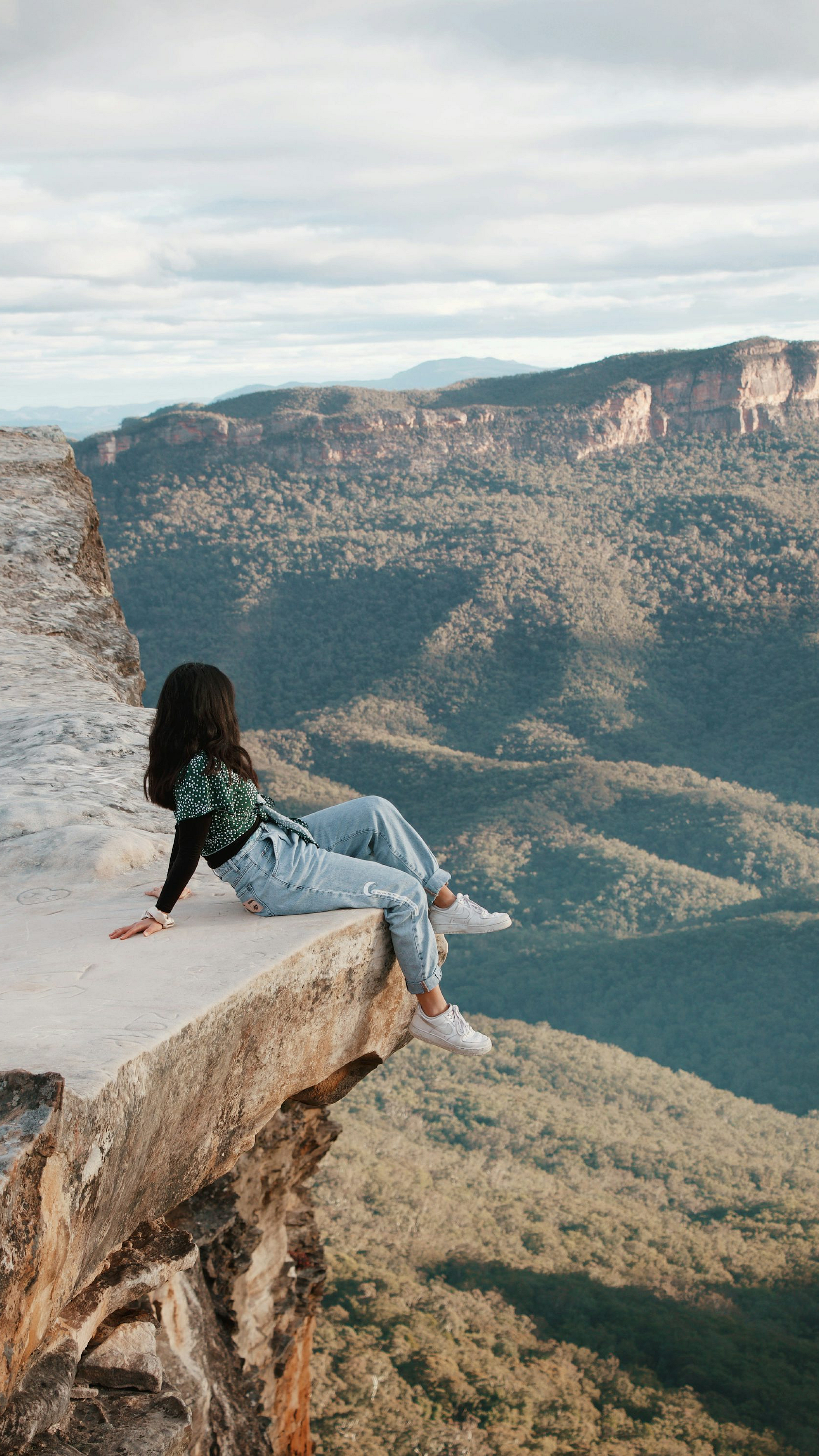 A stunning wallpaper featuring a woman in blue denim jeans casually sitting atop a brown rock formation under the daytime sun. A perfect image for your desktop or mobile background.