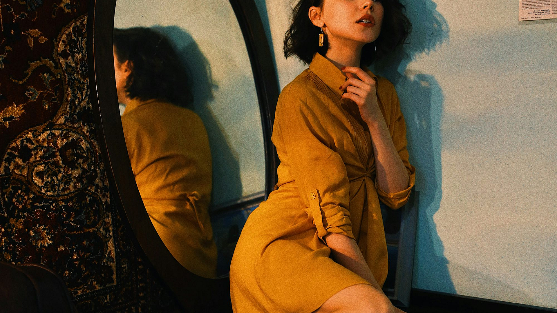 A serene image of a woman in a yellow long-sleeved shirt, comfortably seated on a brown wooden chair. Perfect for a calming desktop or mobile background.