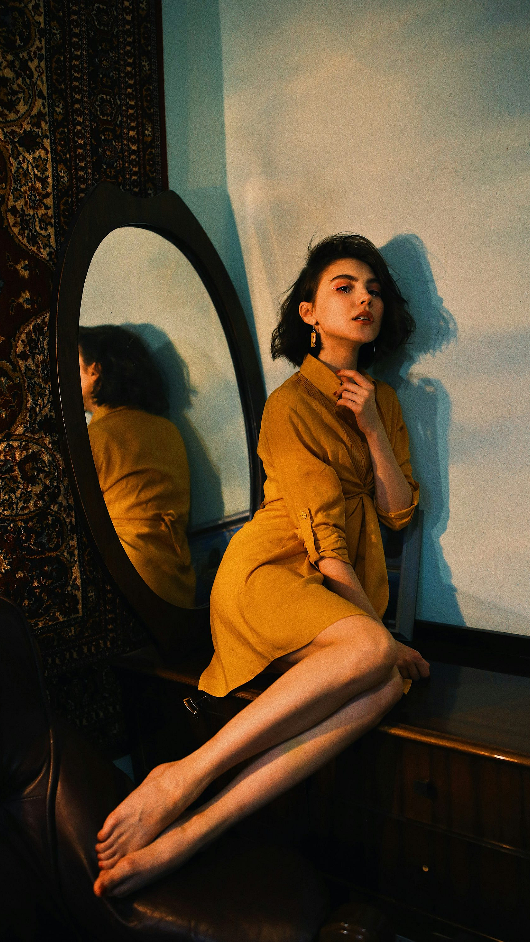 Wallpaper Woman in Yellow Long Sleeve Shirt Sitting on Brown Wooden Chair