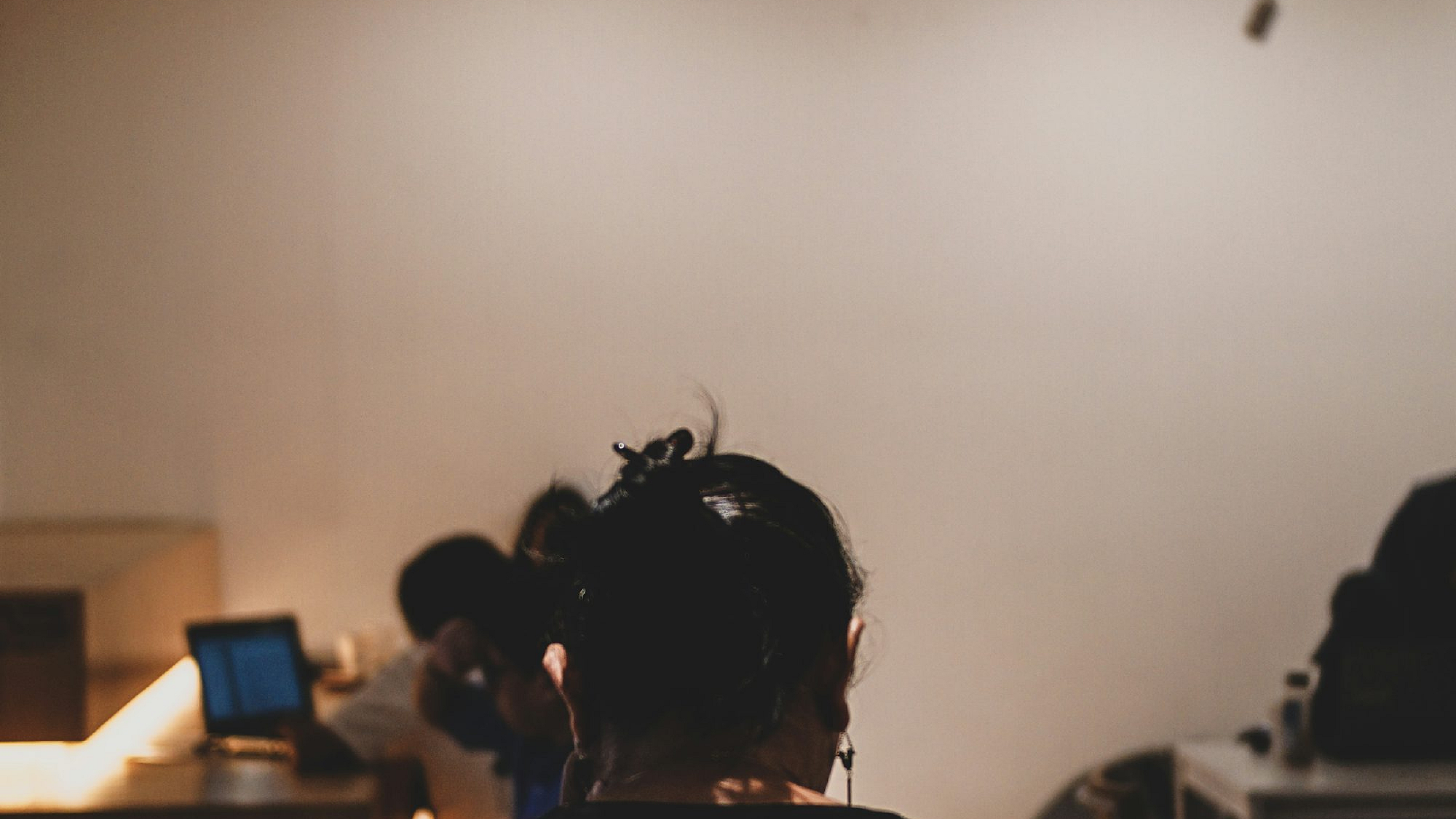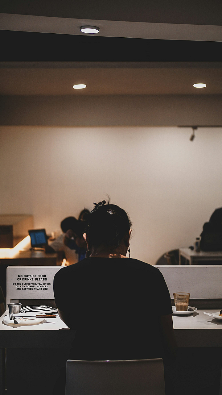 A serene image of a woman calmly sitting at a table, perfect as a calming desktop or phone wallpaper. Offers a peaceful and sophisticated aesthetic.