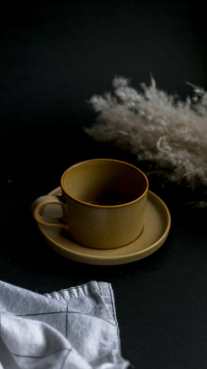 yellow ceramic mug, white textile, mug wallpaper, ceramic mug wallpaper, drinkware wallpaper, cozy wallpaper, minimal wallpaper, simple wallpaper, home wallpaper, still life wallpaper